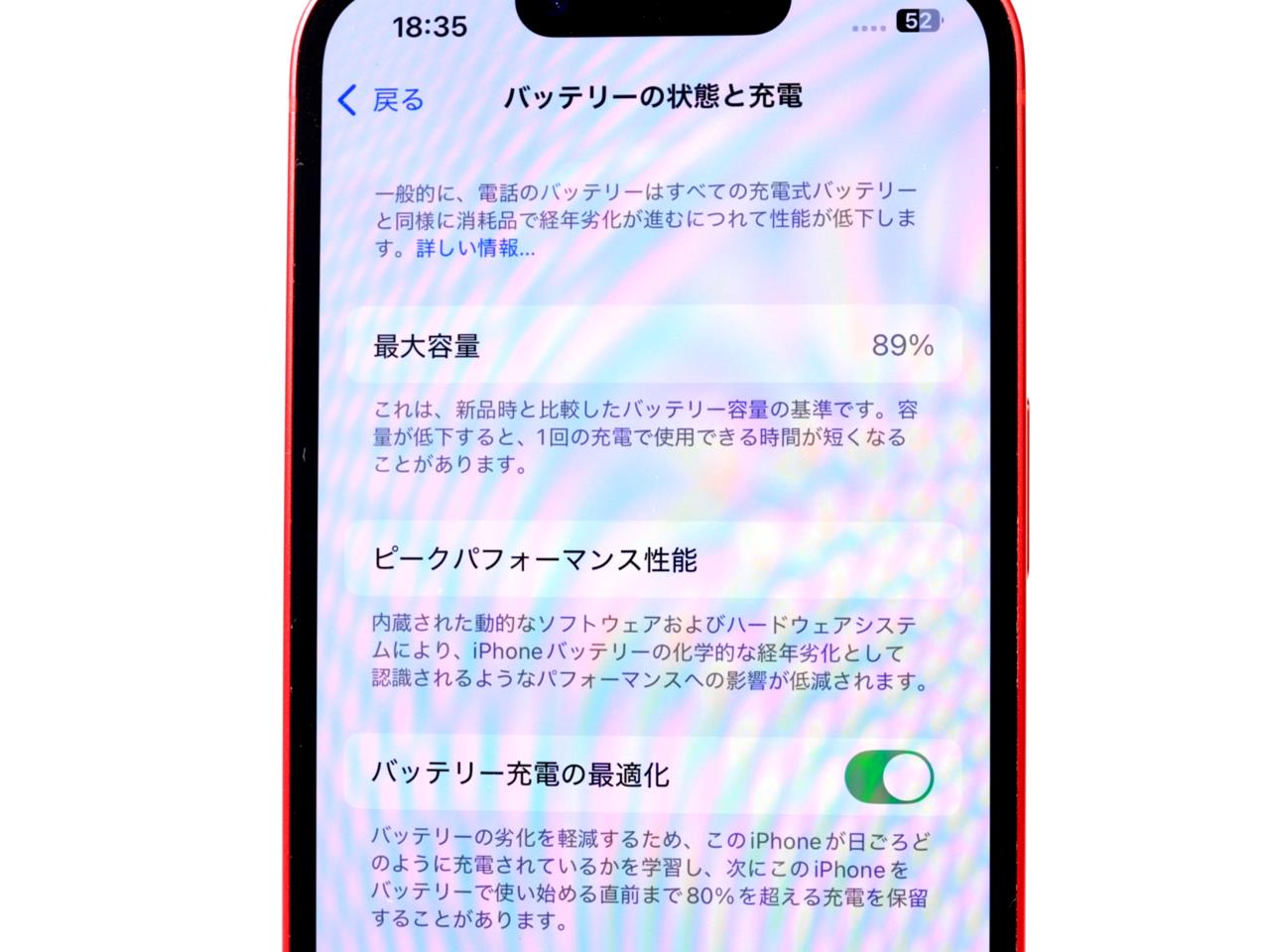 バッテリー最大容量表示=89%です。