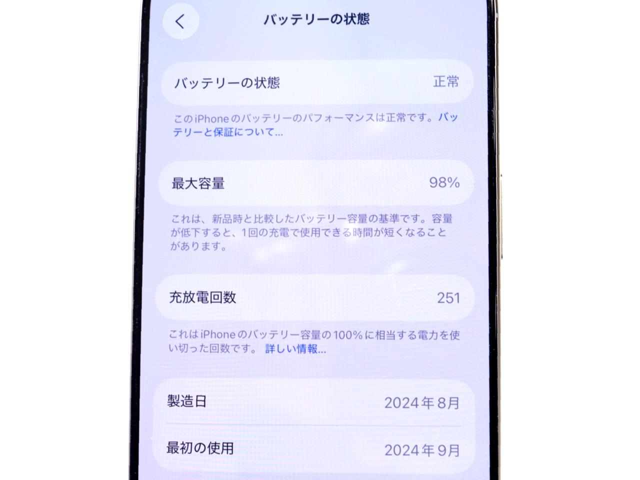 バッテリー最大容量表示=98%です。