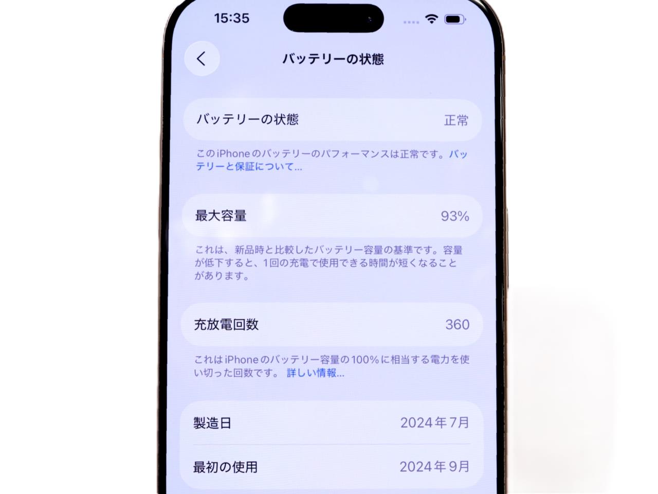 バッテリー最大容量=93%です。