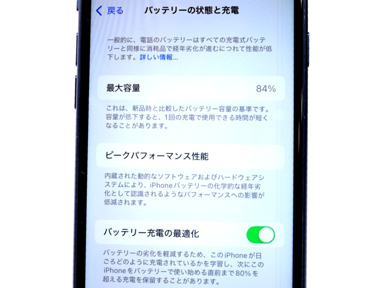 バッテリー最大容量表示=84%です。