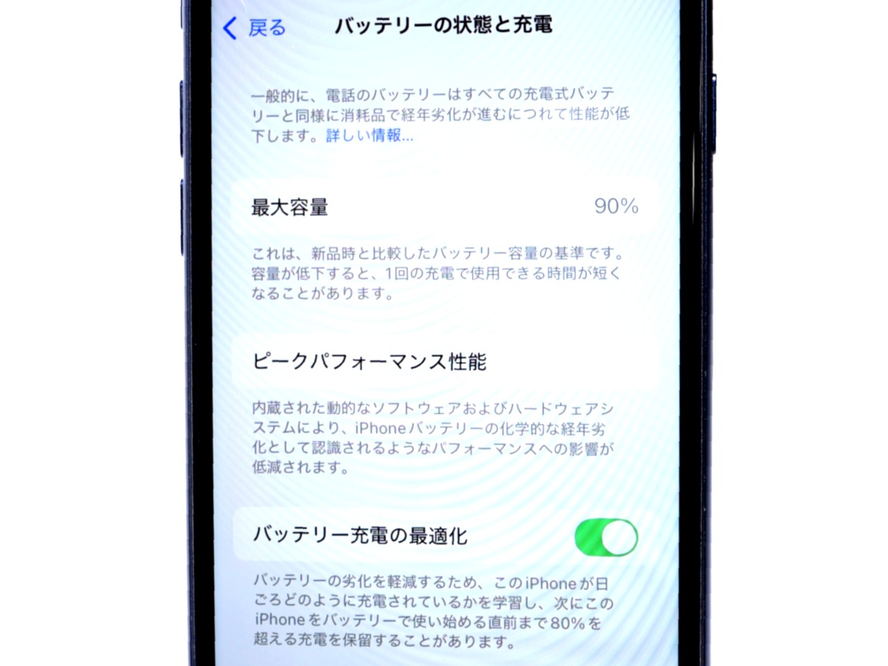 バッテリー最大容量表示=90%です。
