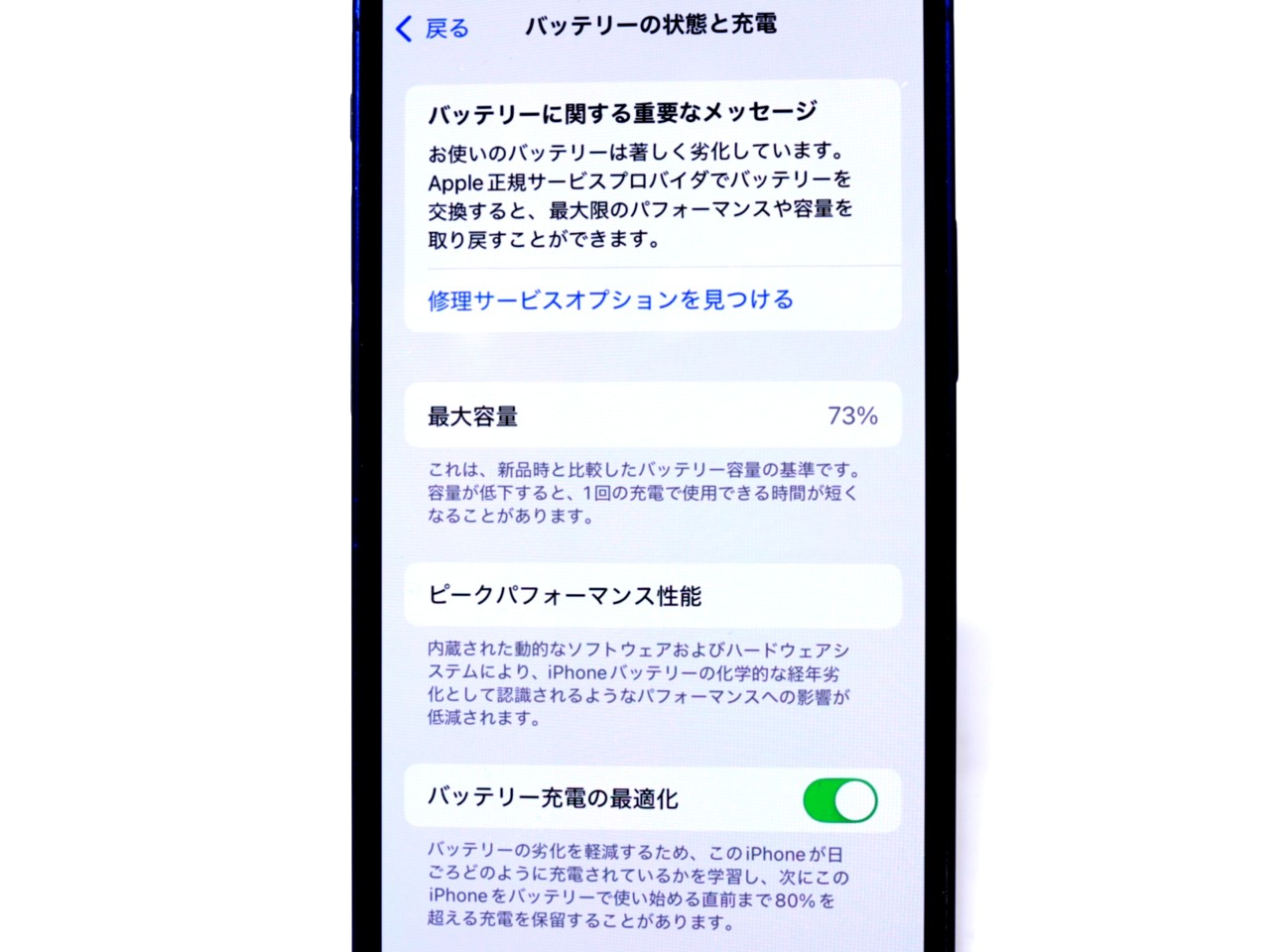 バッテリー最大容量表示=73%です。
