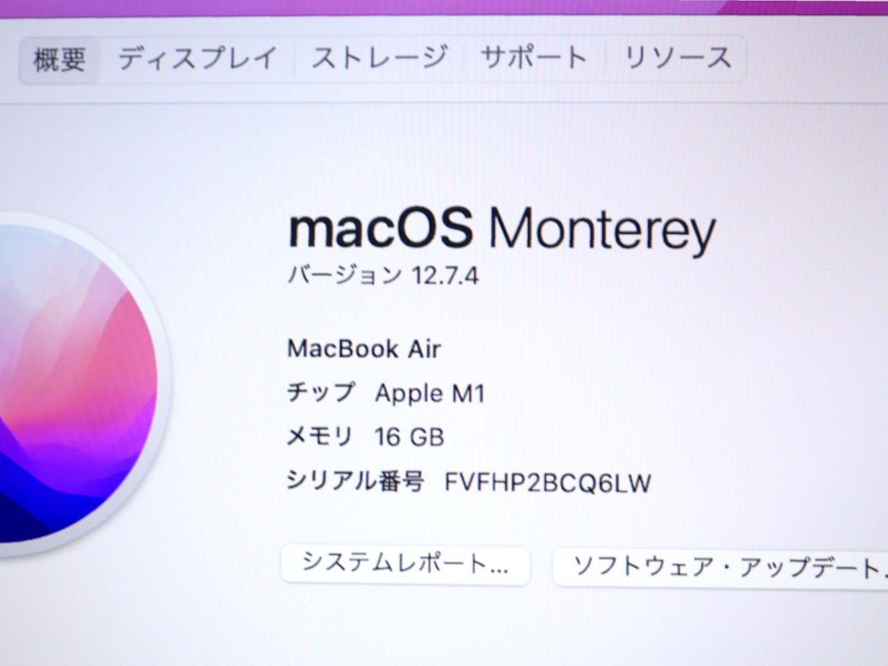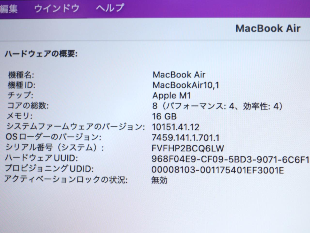 ビデオチップ : Apple M1チップ 7コアGPU 16コアNeural Engine