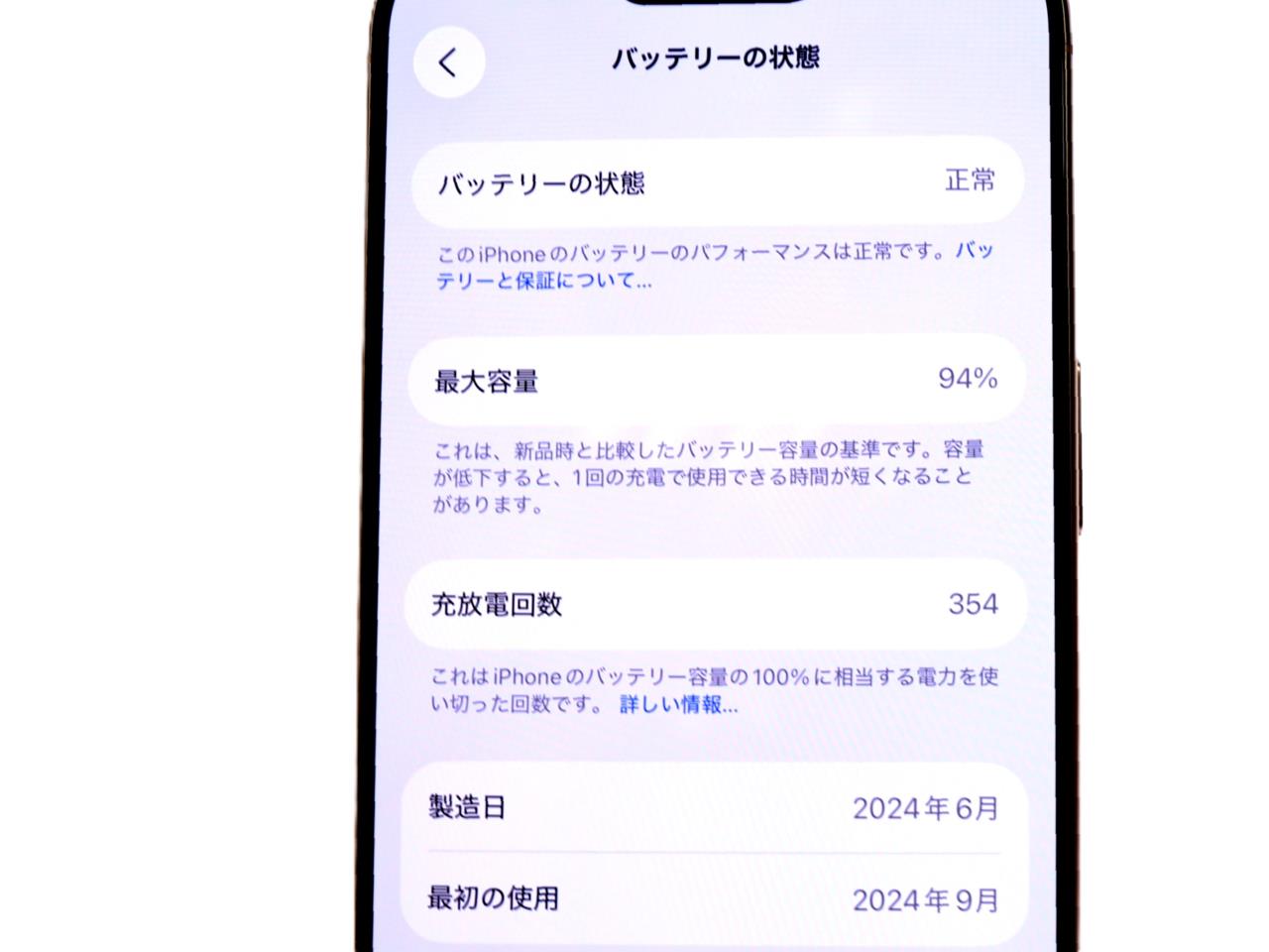 バッテリー最大容量=94%です。 IMEIチェック=各キャリア【-】