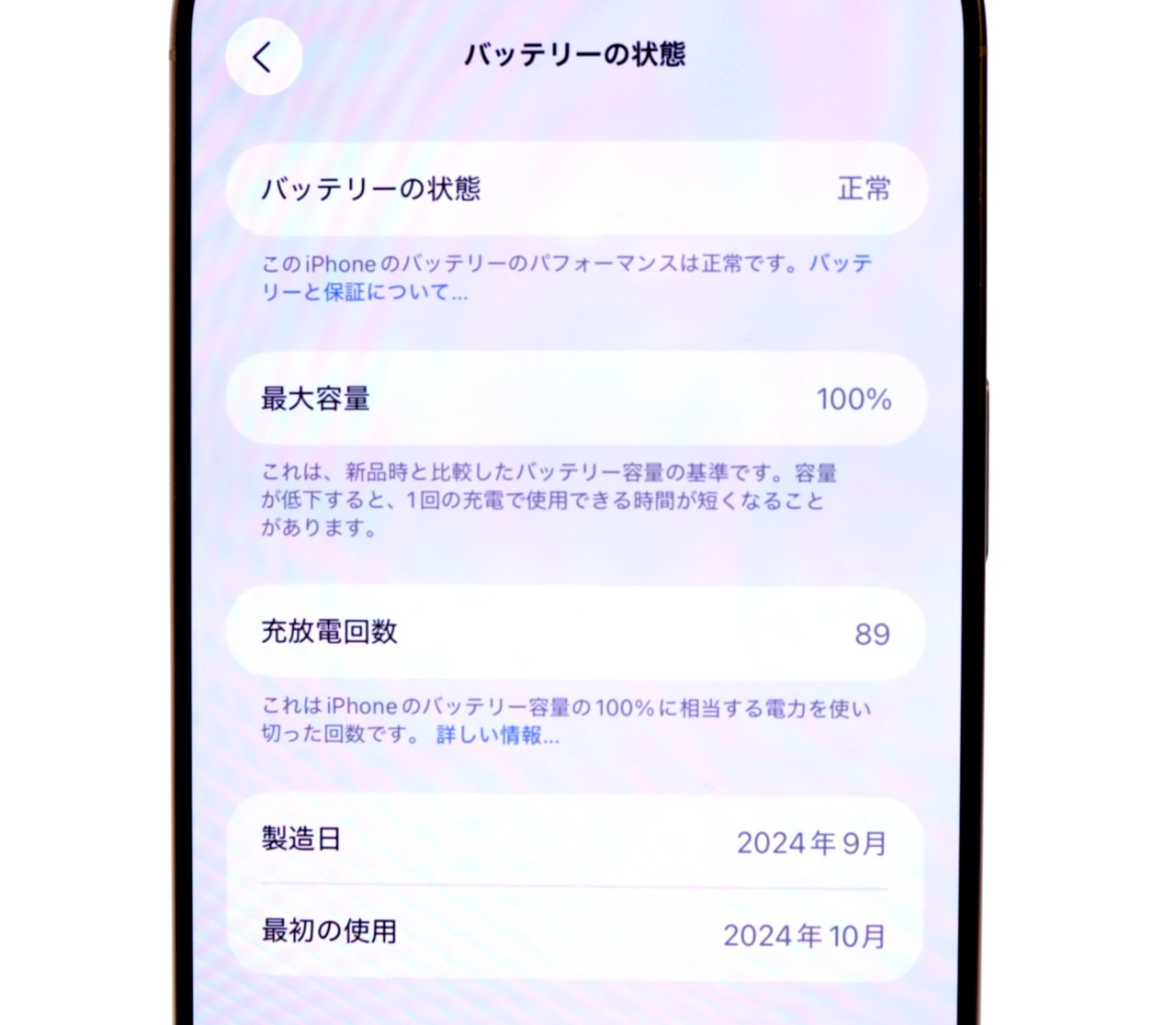バッテリー最大容量=100% 充放電回数=89回