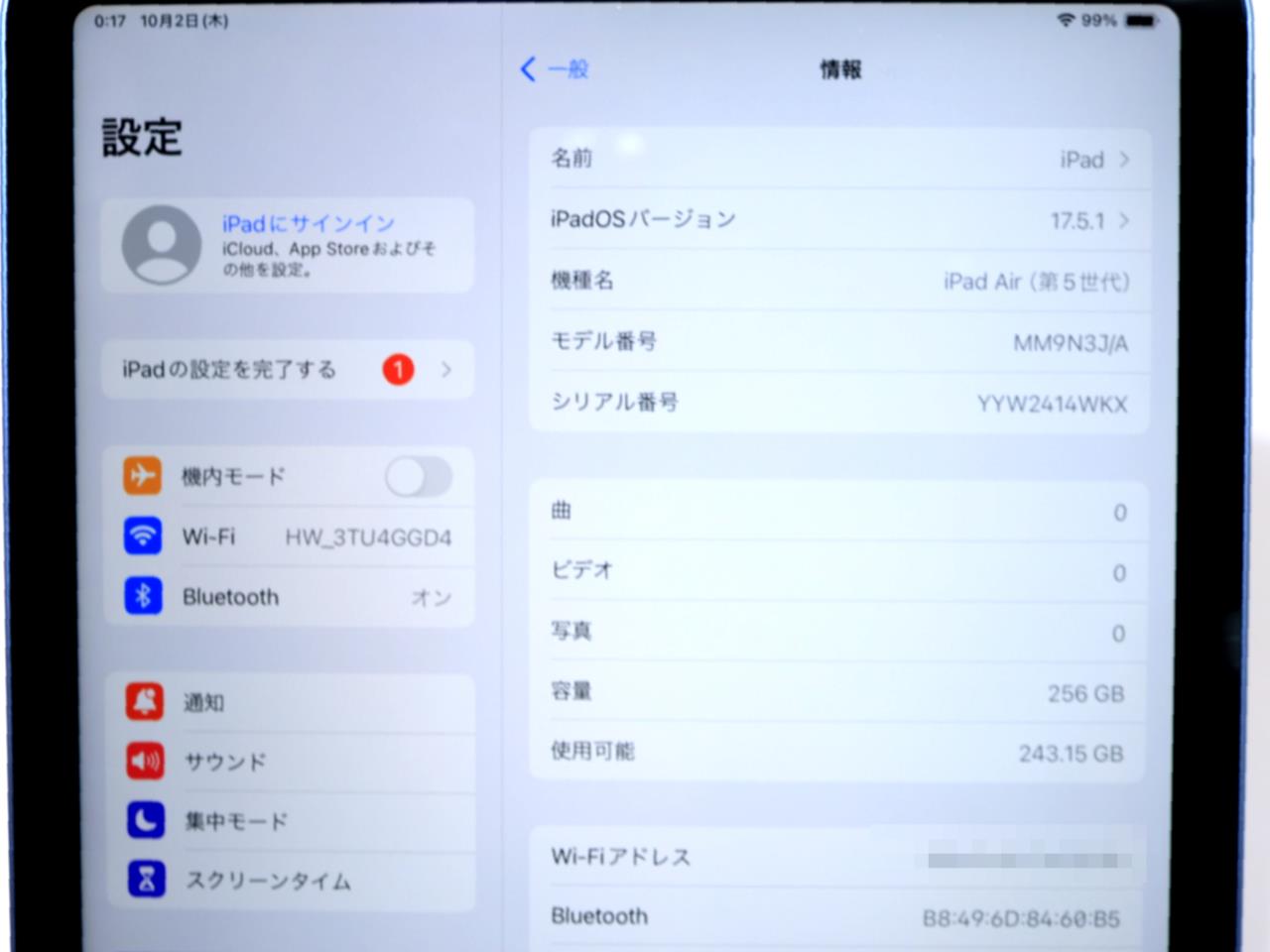 APPLE [USED]u058902 iPad Air 10.9インチ 第5世代 Wi-Fi 256GB 2022年春モデル MM9N3J/A [ブルー] の 商品仕様1: