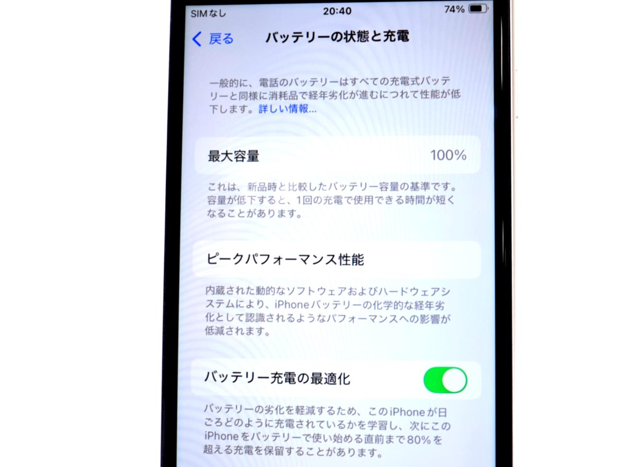 バッテリー最大容量表示=100%です。バッテリー交換履歴あり。
