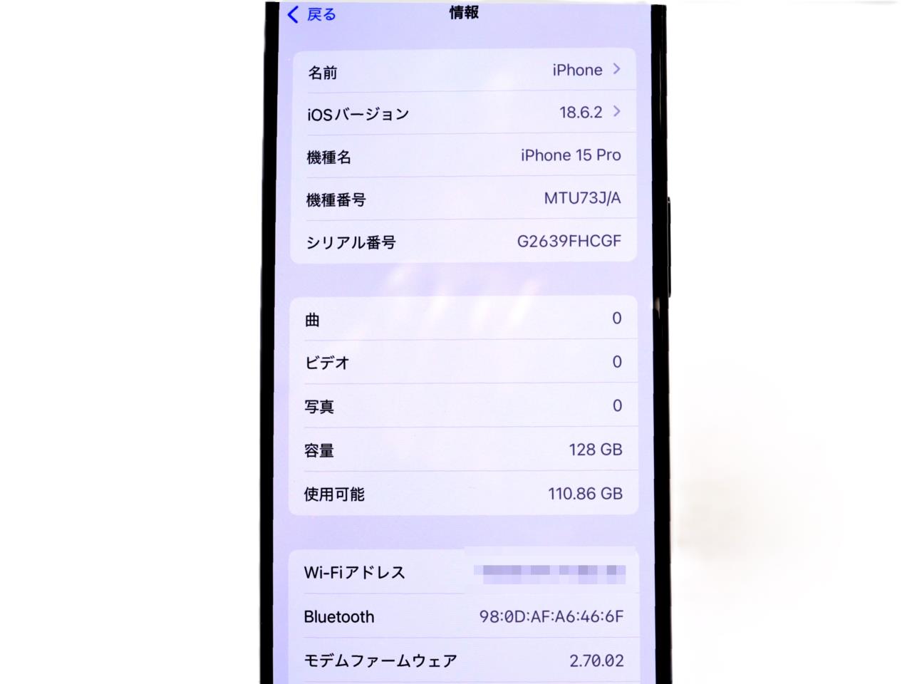 APPLE [USED]u058980 iPhone15 Pro 128GB SIMフリー [ブラックチタニウム] の 商品仕様1: