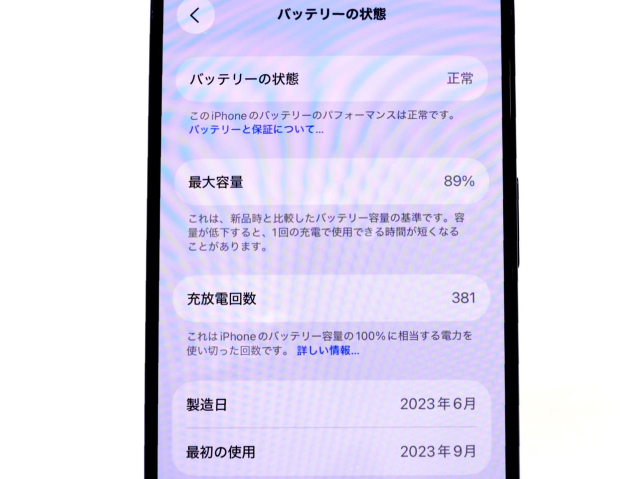 バッテリー最大容量表示=89%です。