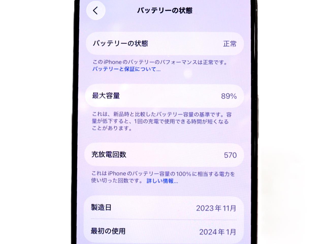 バッテリー最大容量=89%です。