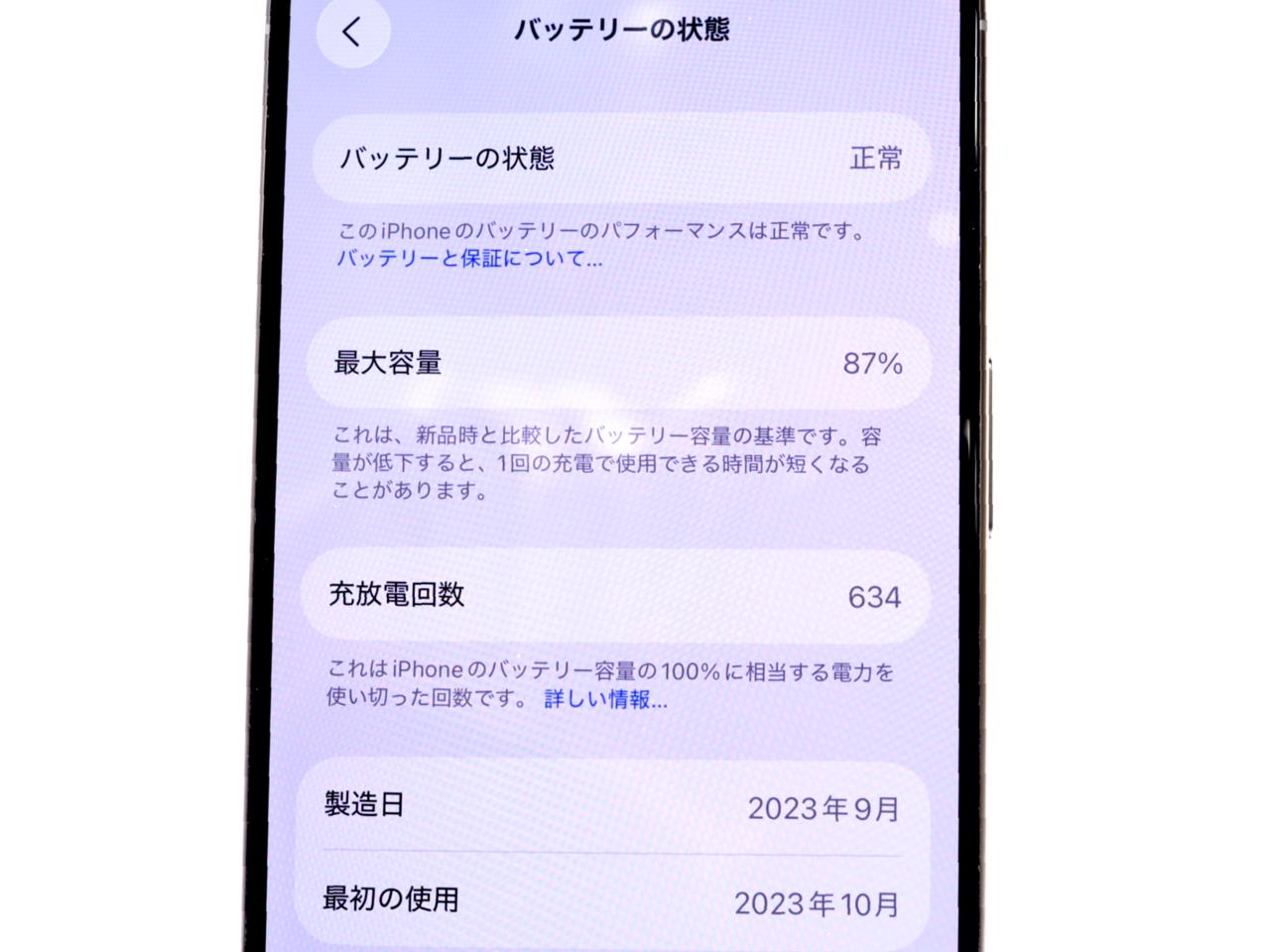 バッテリー最大容量表示=87%です。