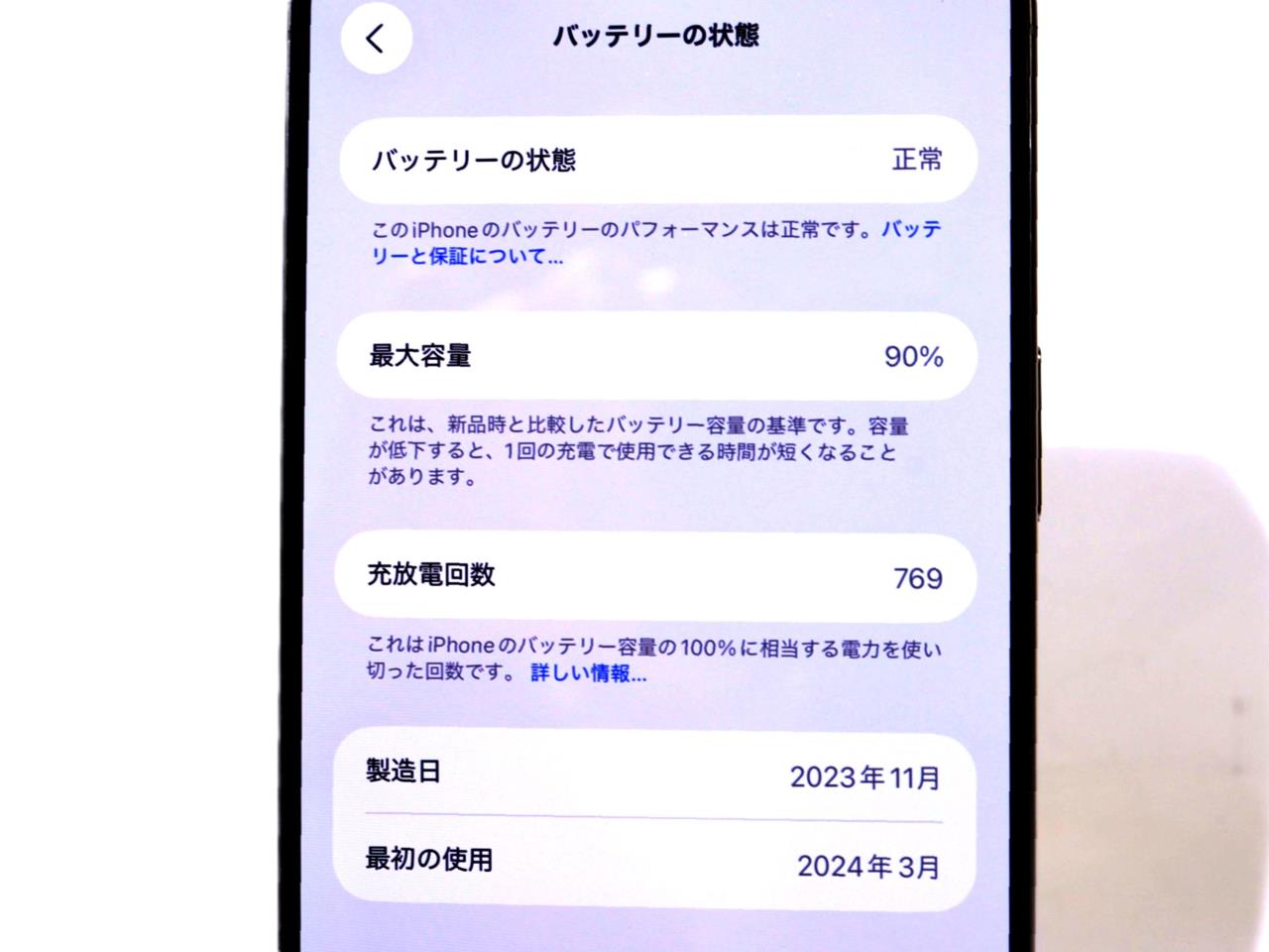 バッテリー最大容量表示=90%です。