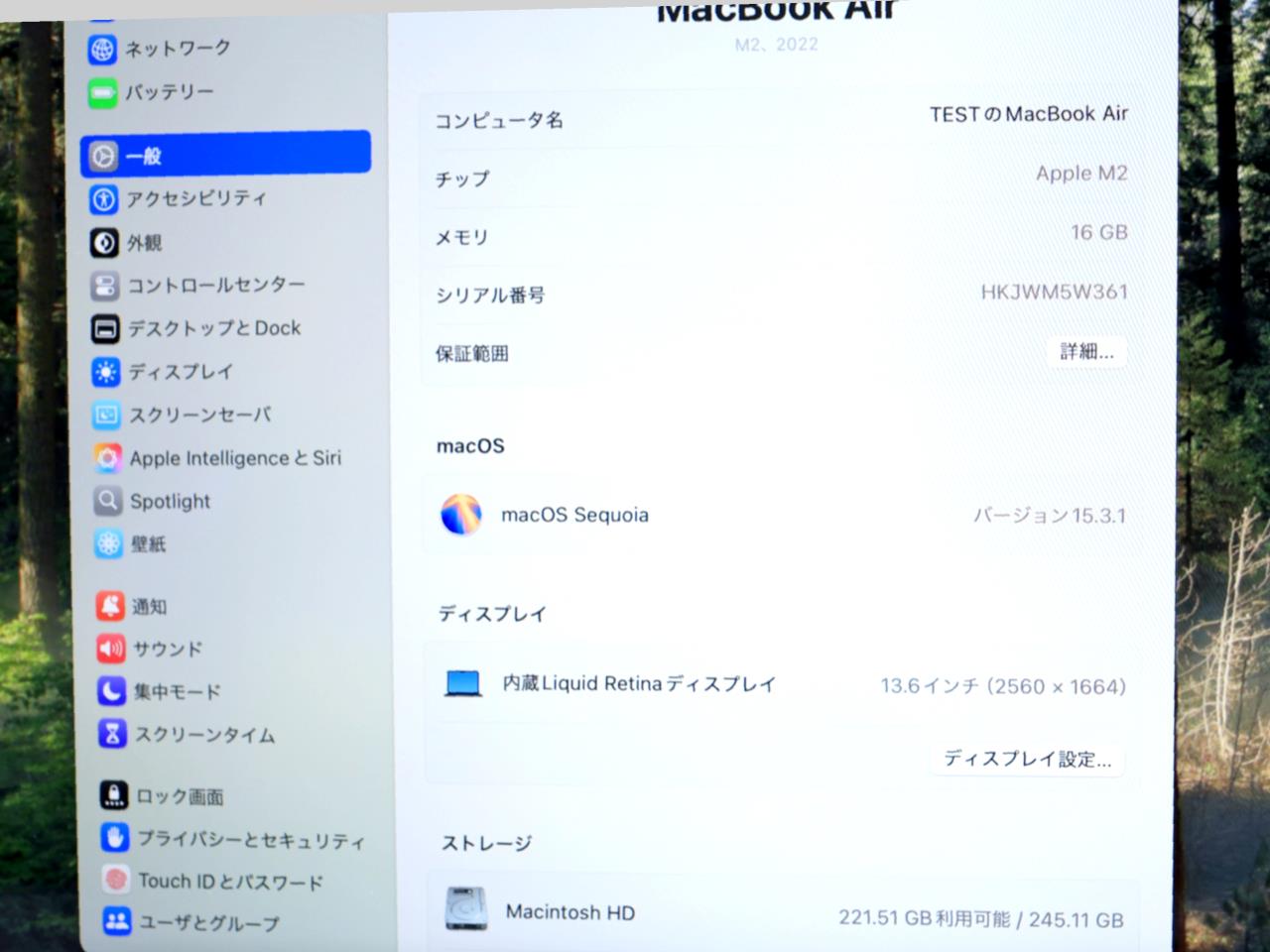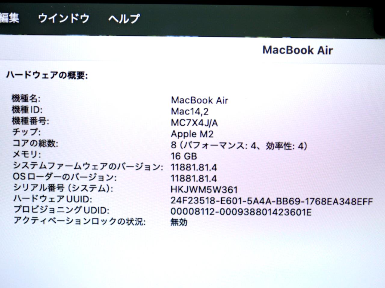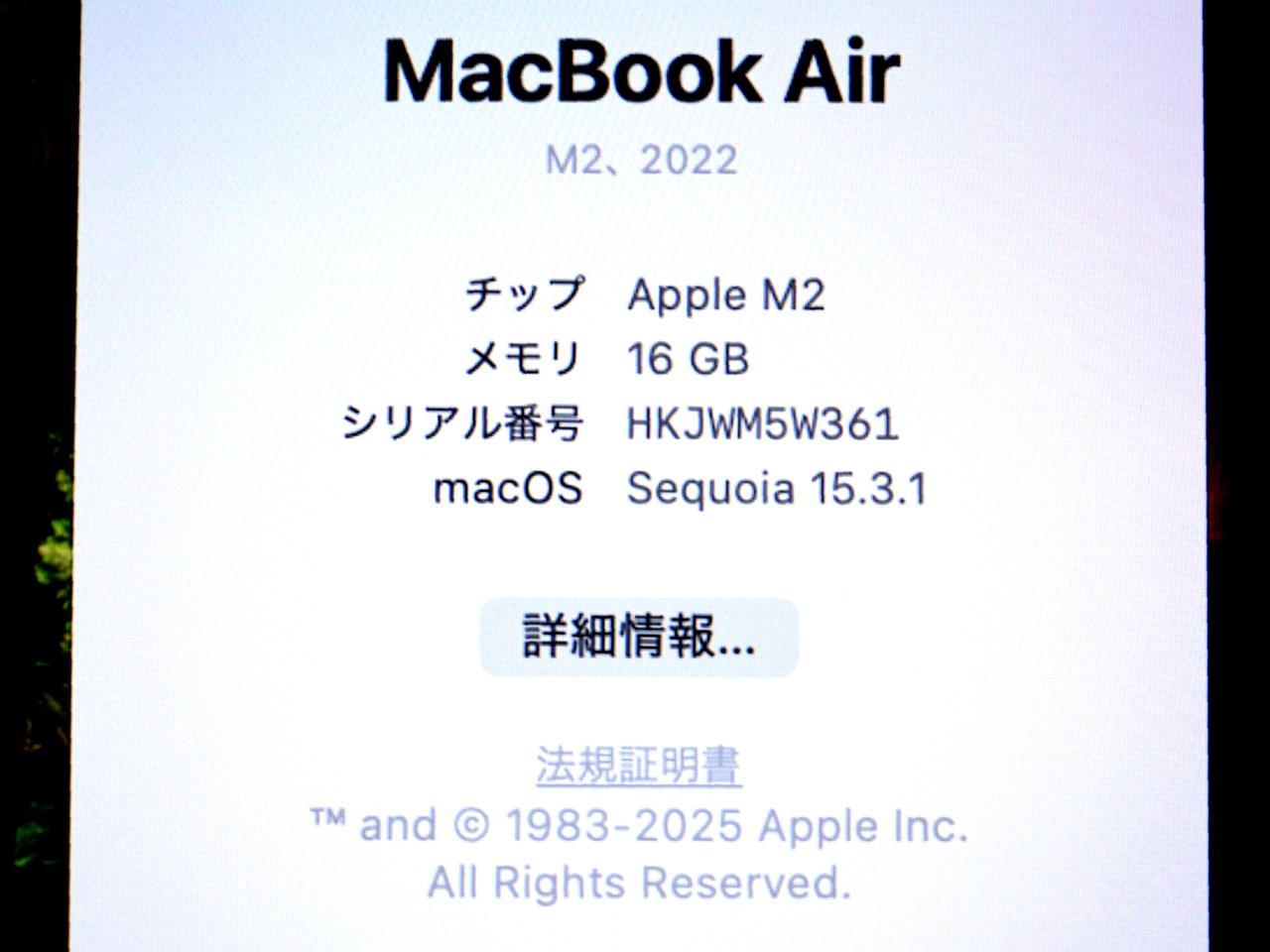 ビデオチップ : Apple M2チップ 8コアGPU 16コアNeural Engine