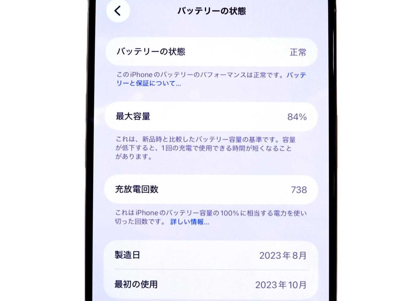 バッテリー最大容量表示=84%です。