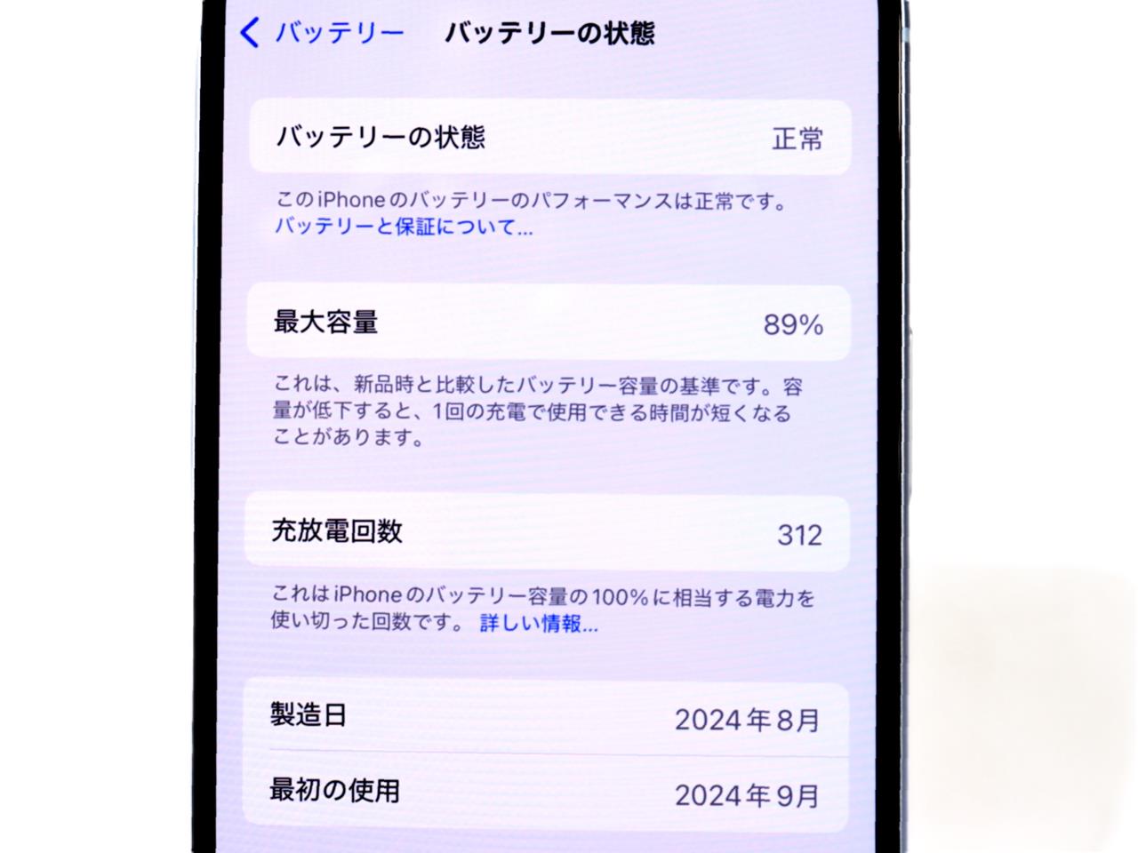 バッテリー最大容量表示=89%です。 (写真に写らない)