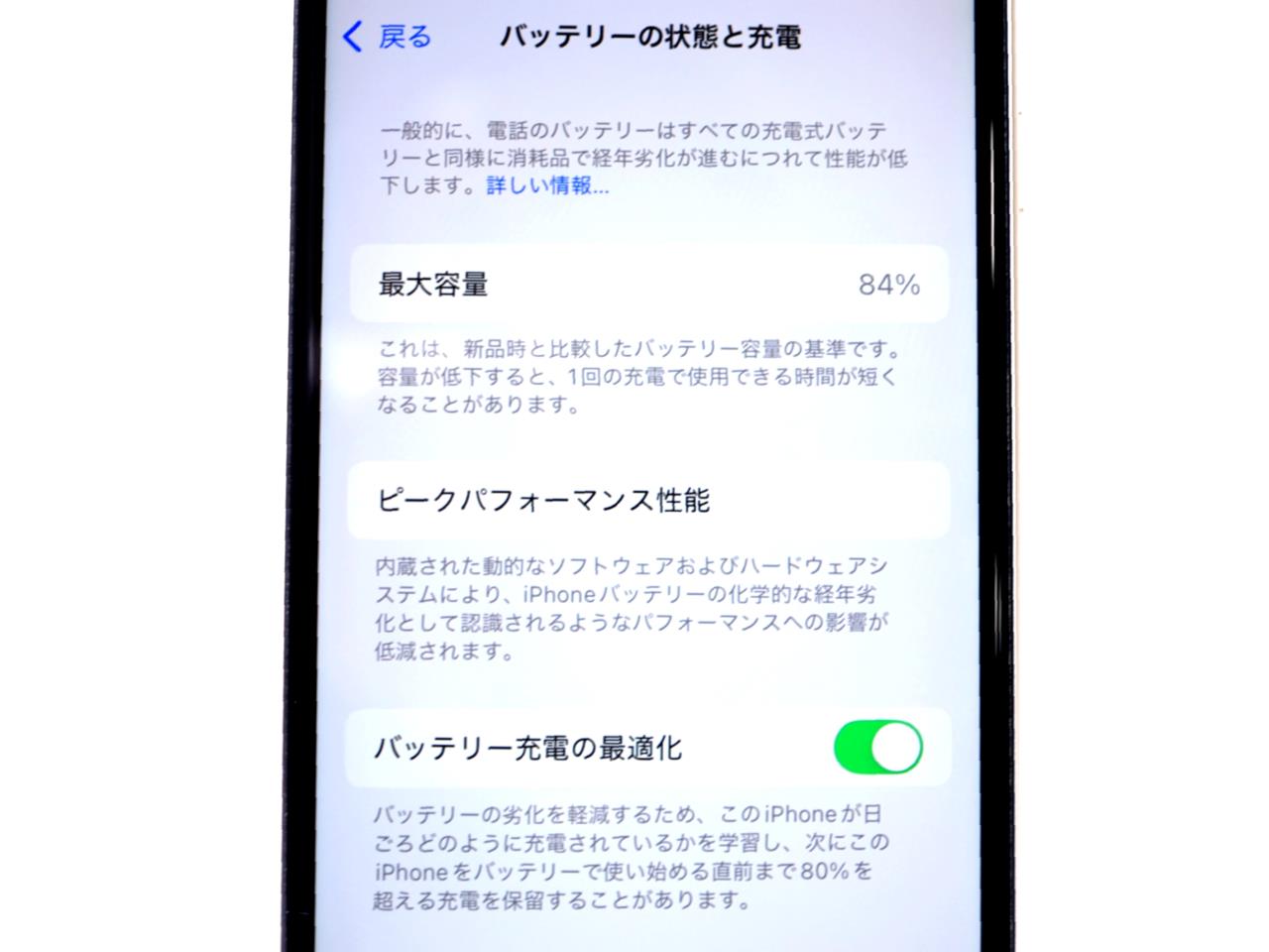 バッテリー最大容量表示=84%です。