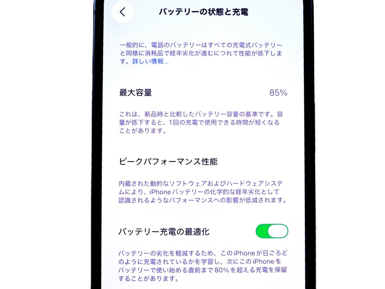 バッテリー最大容量表示=85%です。