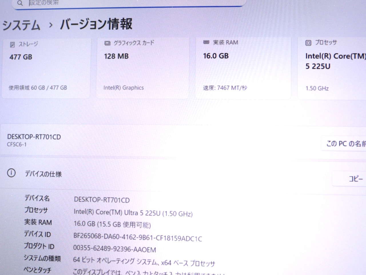 CPU : インテル Core Ultra 5 225U(Arrow Lake) 1.5GHz/12コア
