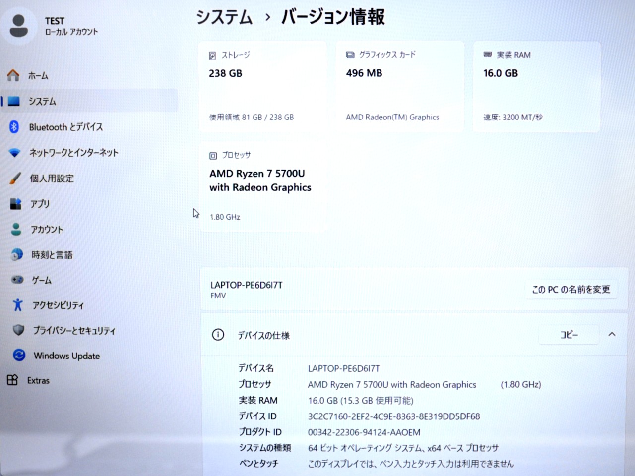 CPU:AMD Ryzen 7 5700U/1.8GHz/8コア