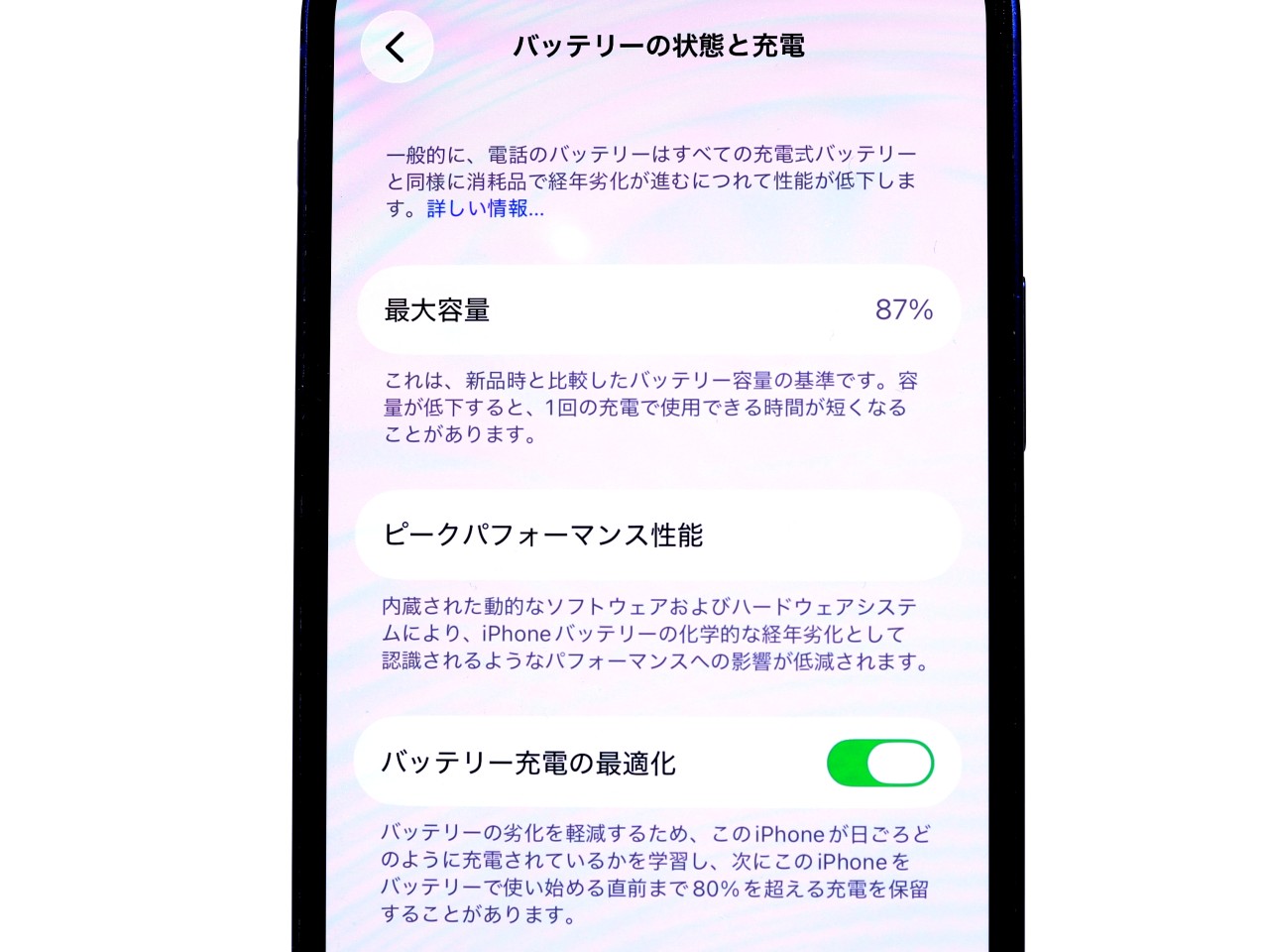 バッテリー最大容量表示=87%です。
