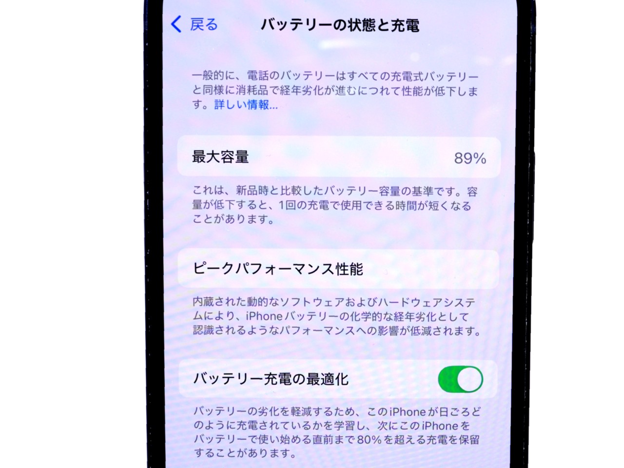 バッテリー最大容量=89%です。