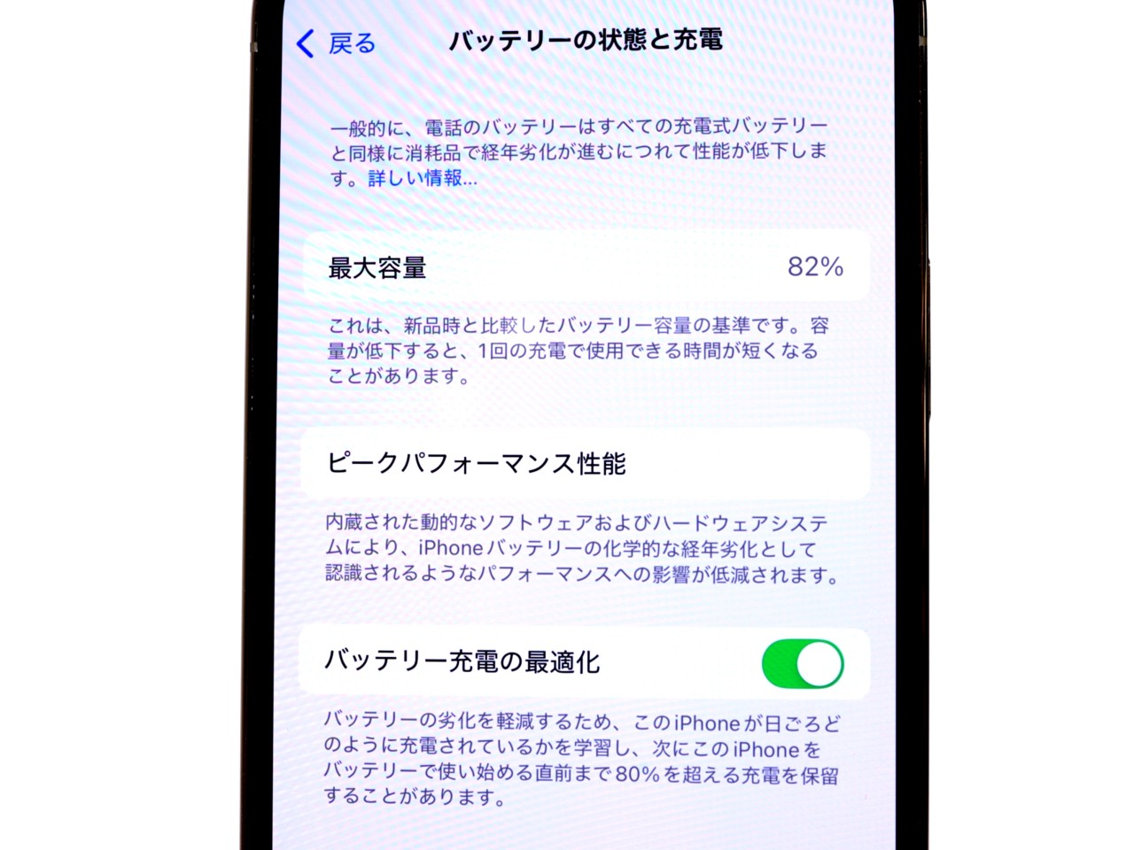 バッテリー最大容量表示=82%です。