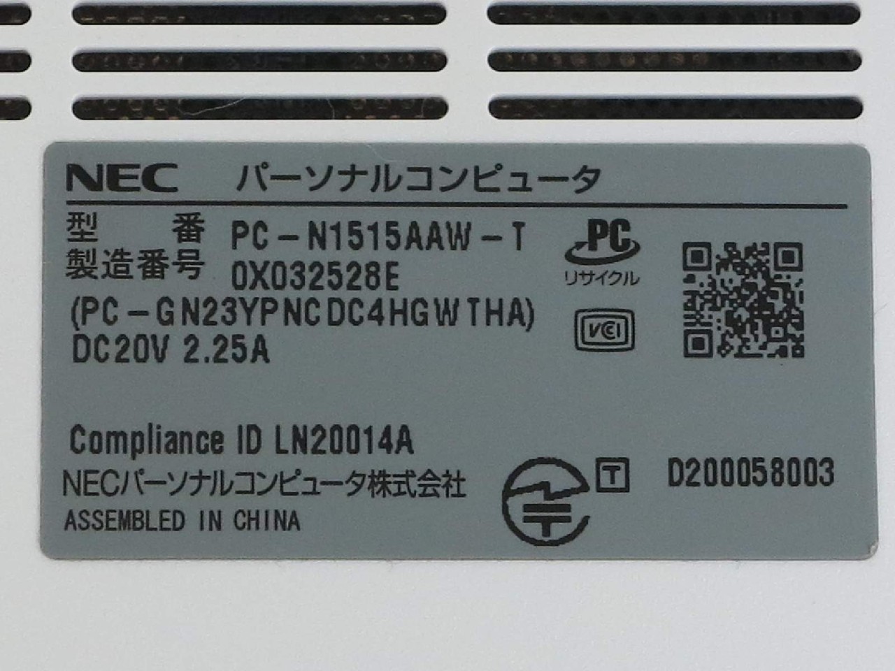 NEC [USED]u059652 PC-N1515AAW [パールホワイト] -バッテリ駆動不可- の 商品仕様1: