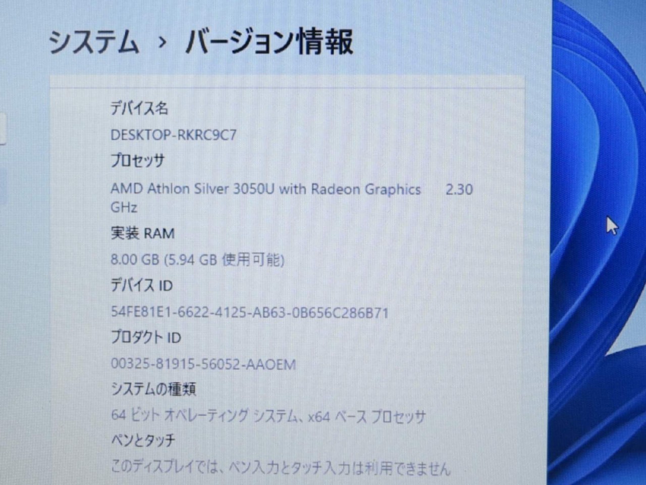 CPU : AMD Athlon Silver 3050U 2.3GHz/2コア