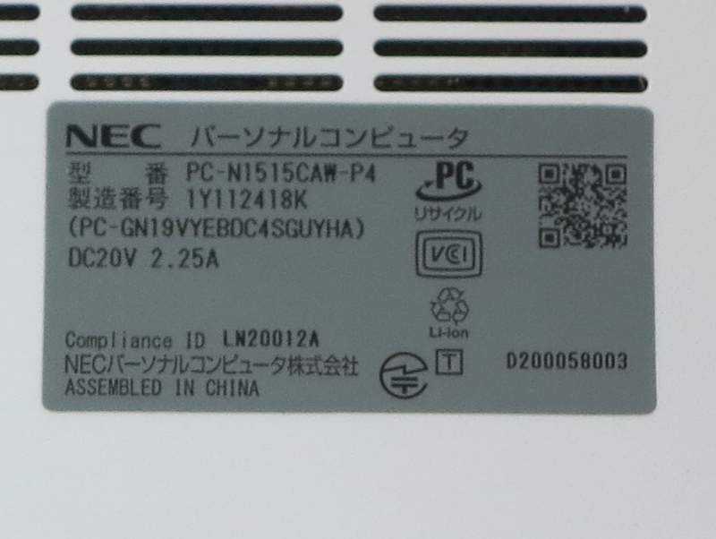 NEC [USED]u059653 PC-N1515CAW-P4 [パールホワイト] の 商品仕様1: