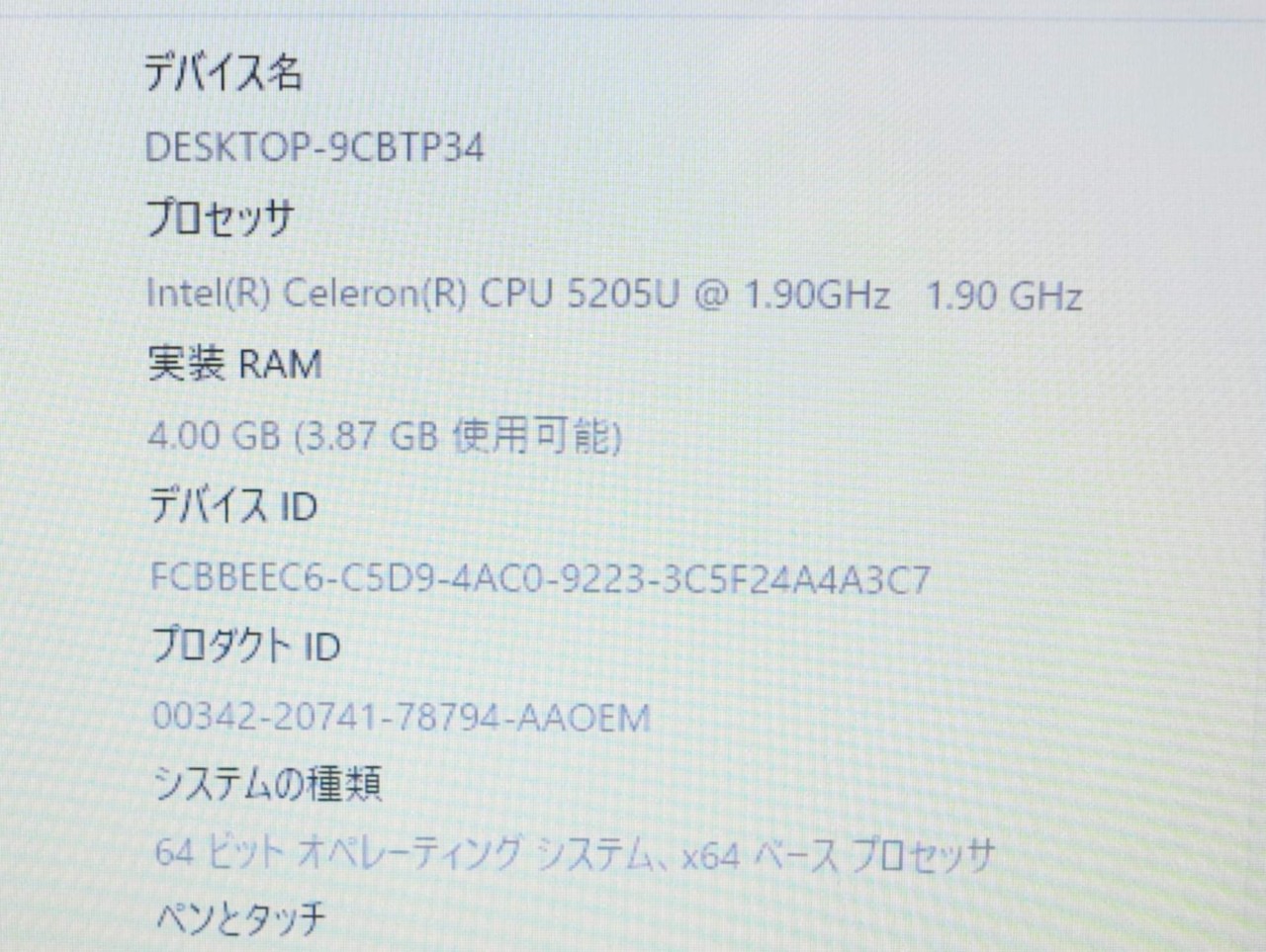 CPU : インテル Celeron 5205U(Comet Lake) 1.9GHz/2コア