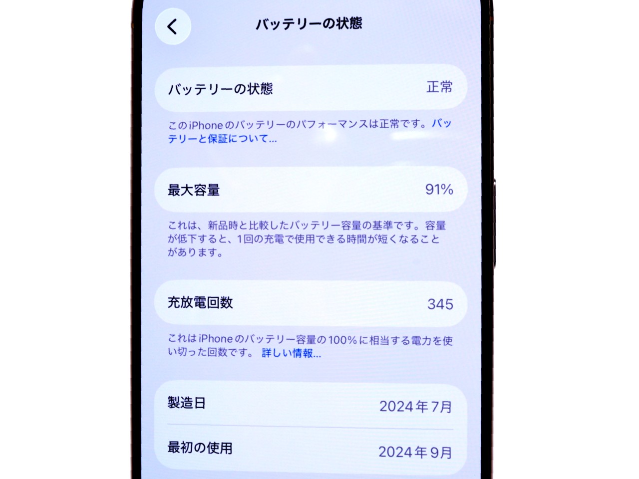 バッテリー最大容量=91%です。