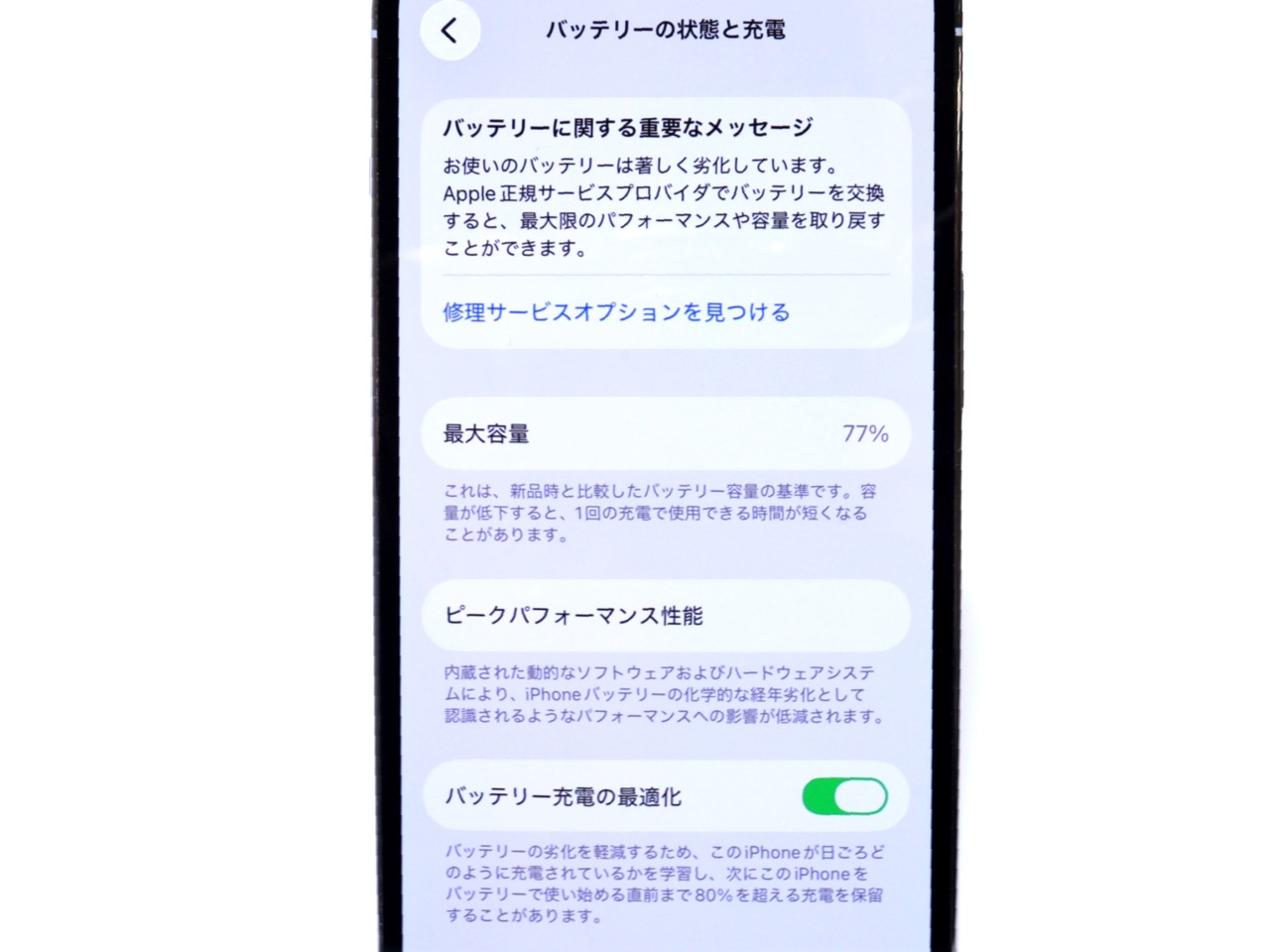 バッテリー最大容量=77%です。バッテリー劣化が進んでおります。