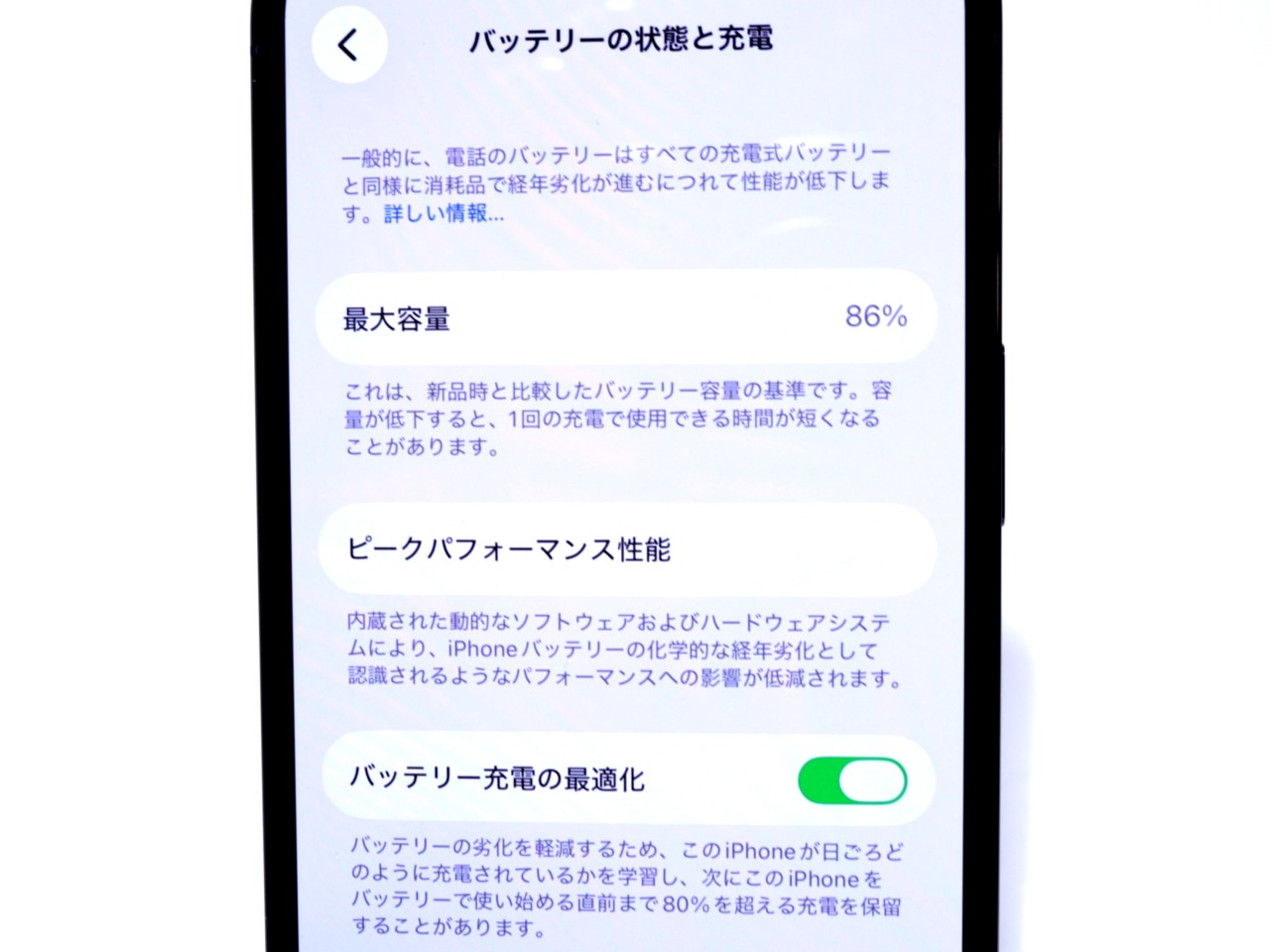 バッテリー最大容量=86%です。