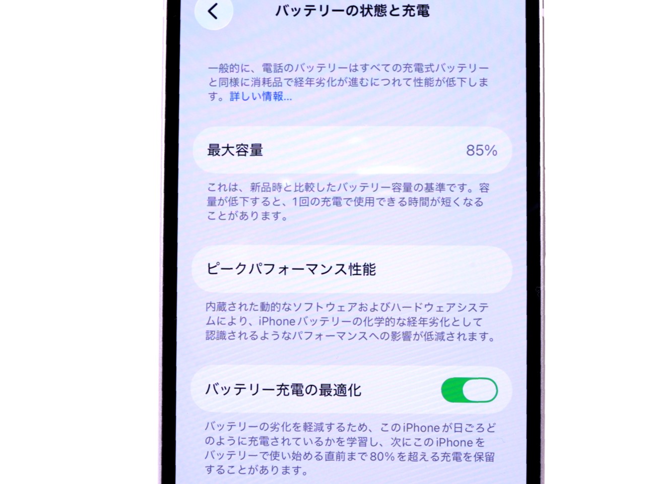 バッテリー最大容量=85%です。