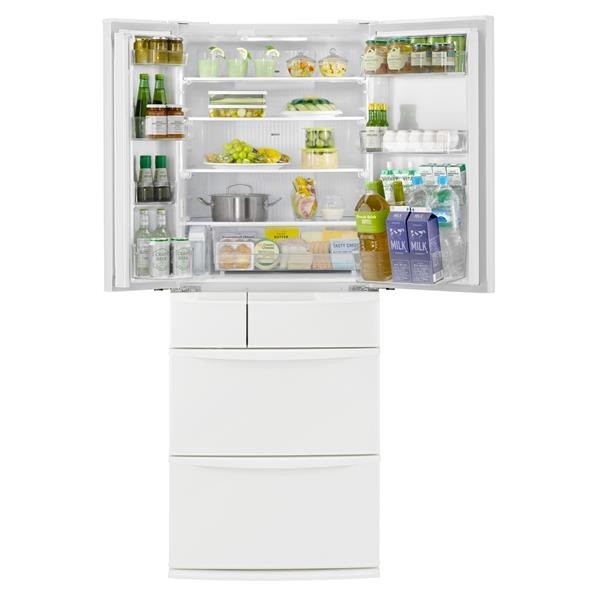 奥行き薄型63cmの冷蔵庫(451L)。冷凍室(下段)も野菜室も引き出しが100%全開できる「奥まで見えるフルオープン」により、見やすく、整理しやすい