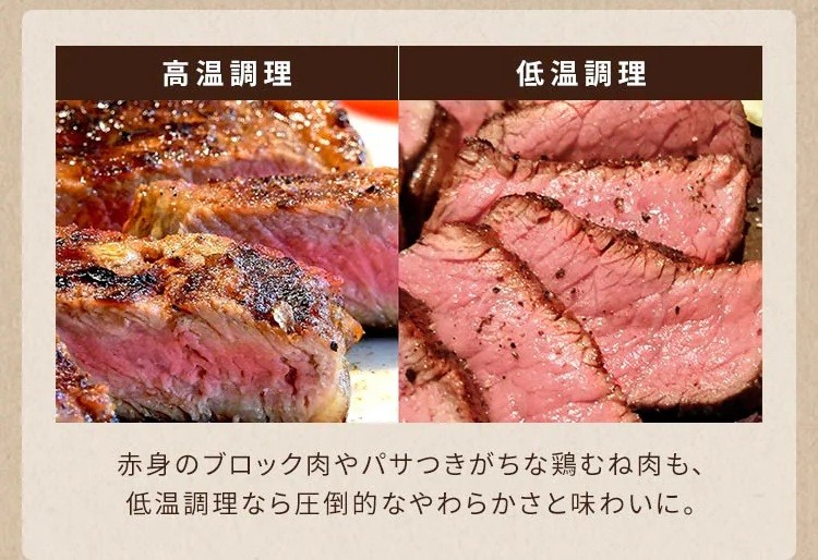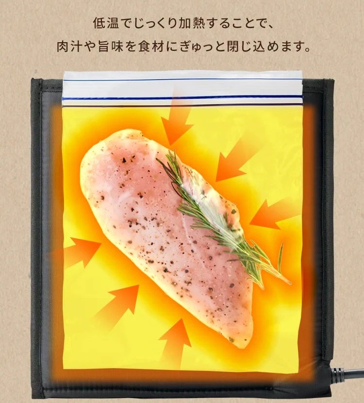 低温でじっくり加熱することで、肉汁や旨味を食材にぎゅっと閉じ込める袋型低温調理器