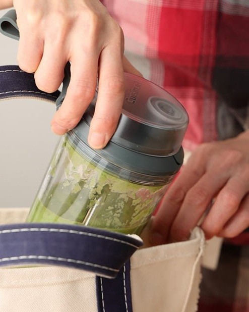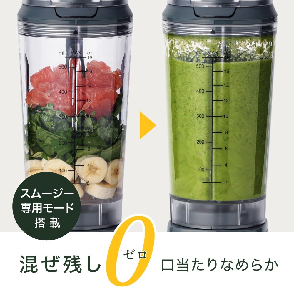 混ぜ残しゼロでなめらかな仕上がりに 飲み口付きのブレンダーカップでそのまま飲める