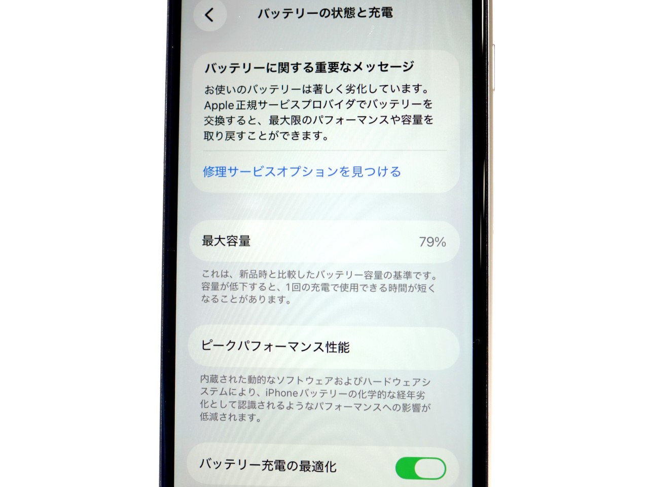 バッテリー最大容量=79%です。劣化が進んでおります。