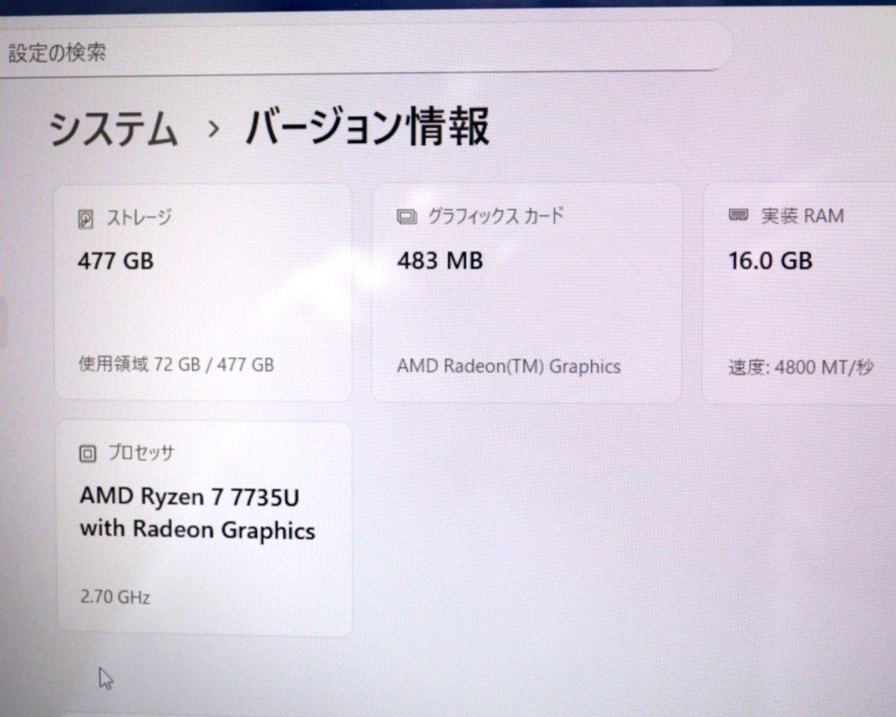 CPU : AMD Ryzen 7 7735U 2.7GHz/8コア