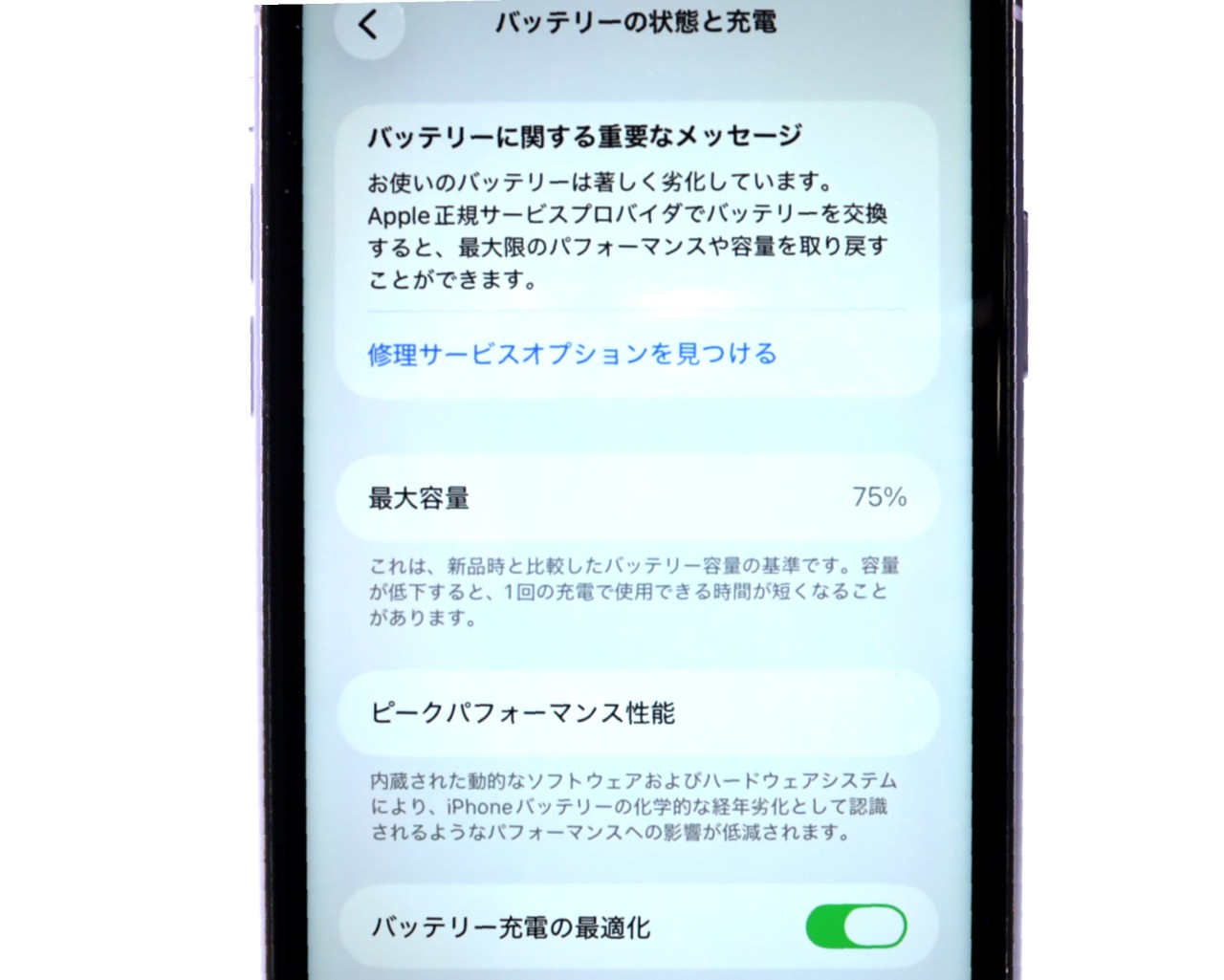 バッテリー最大容量=75%です。バッテリー劣化が進んでおります。