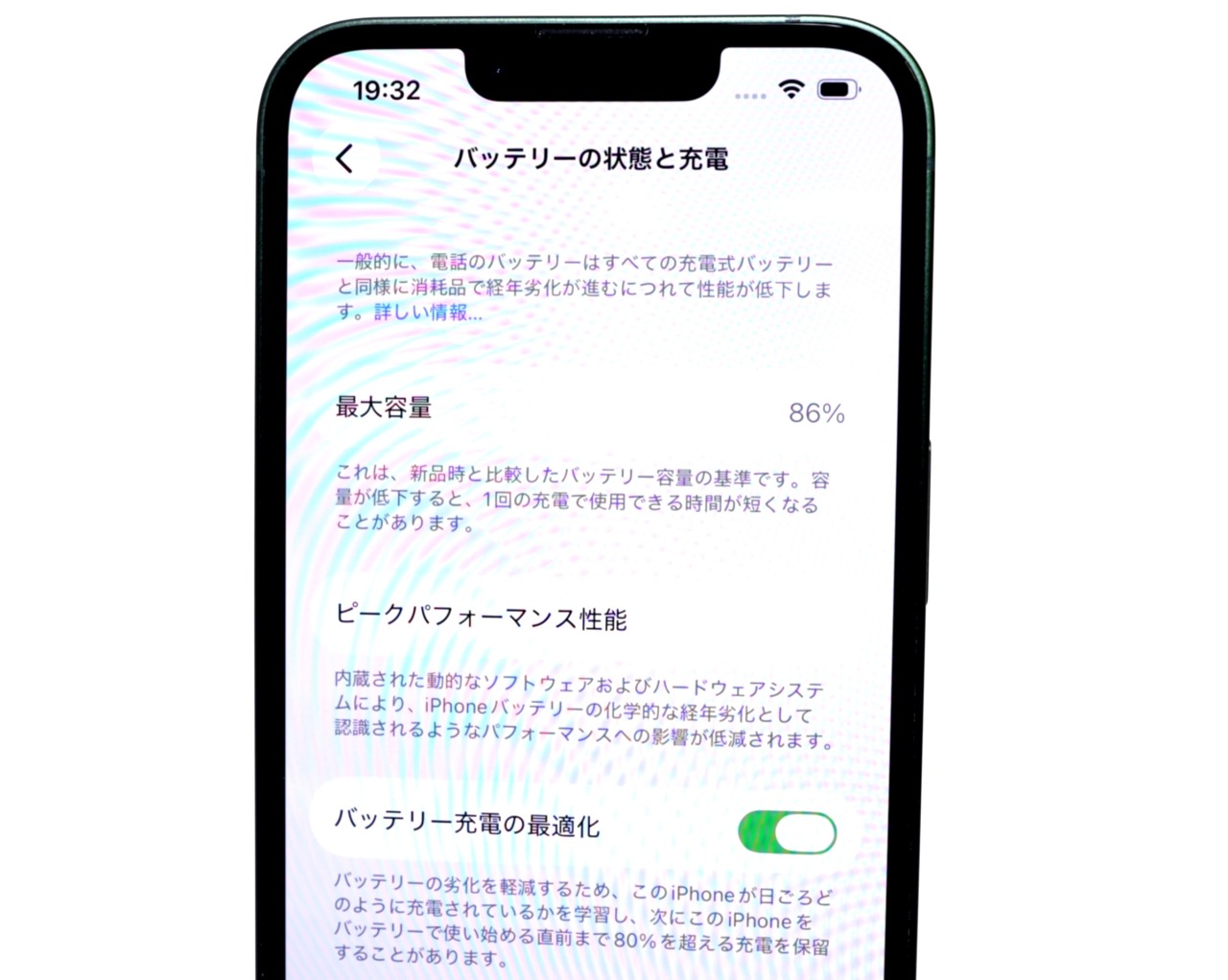 バッテリー最大容量=86%です。