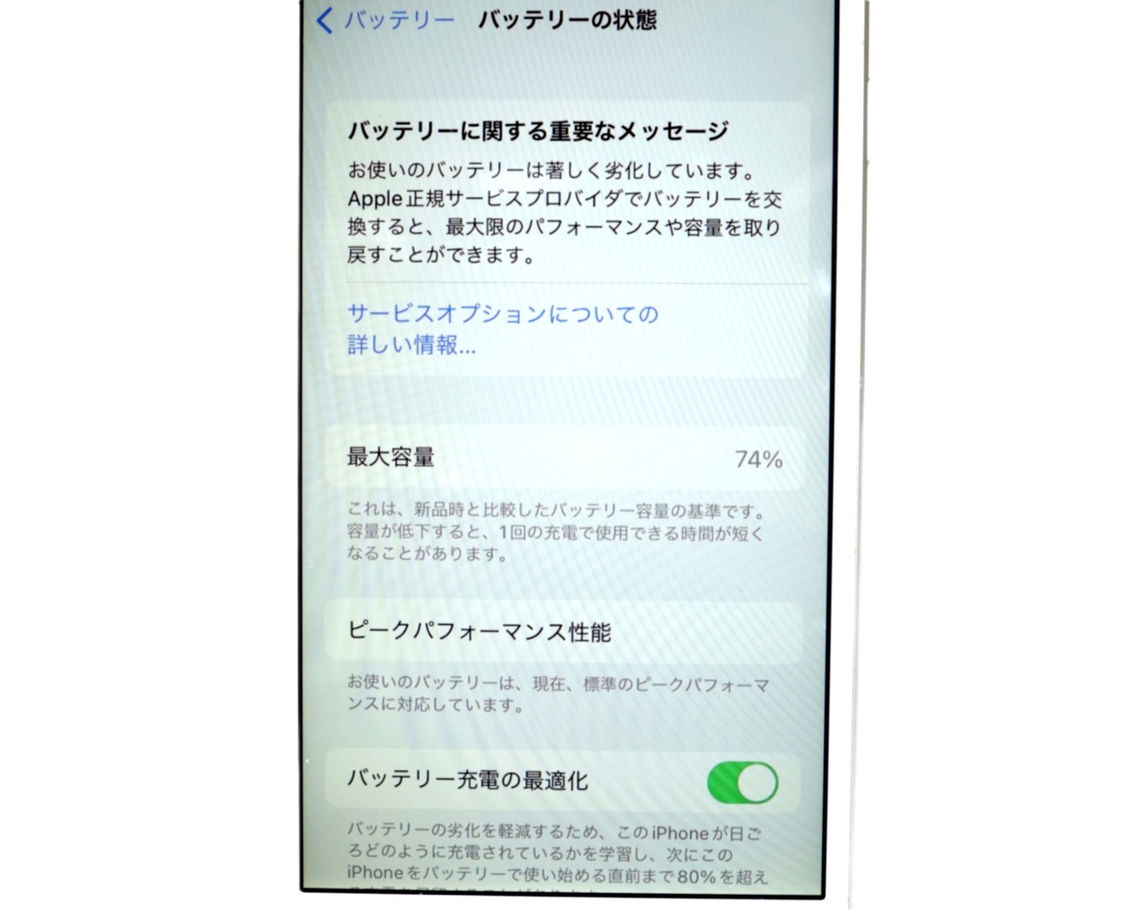 バッテリー最大容量=74%です。バッテリー劣化が進んでおります。