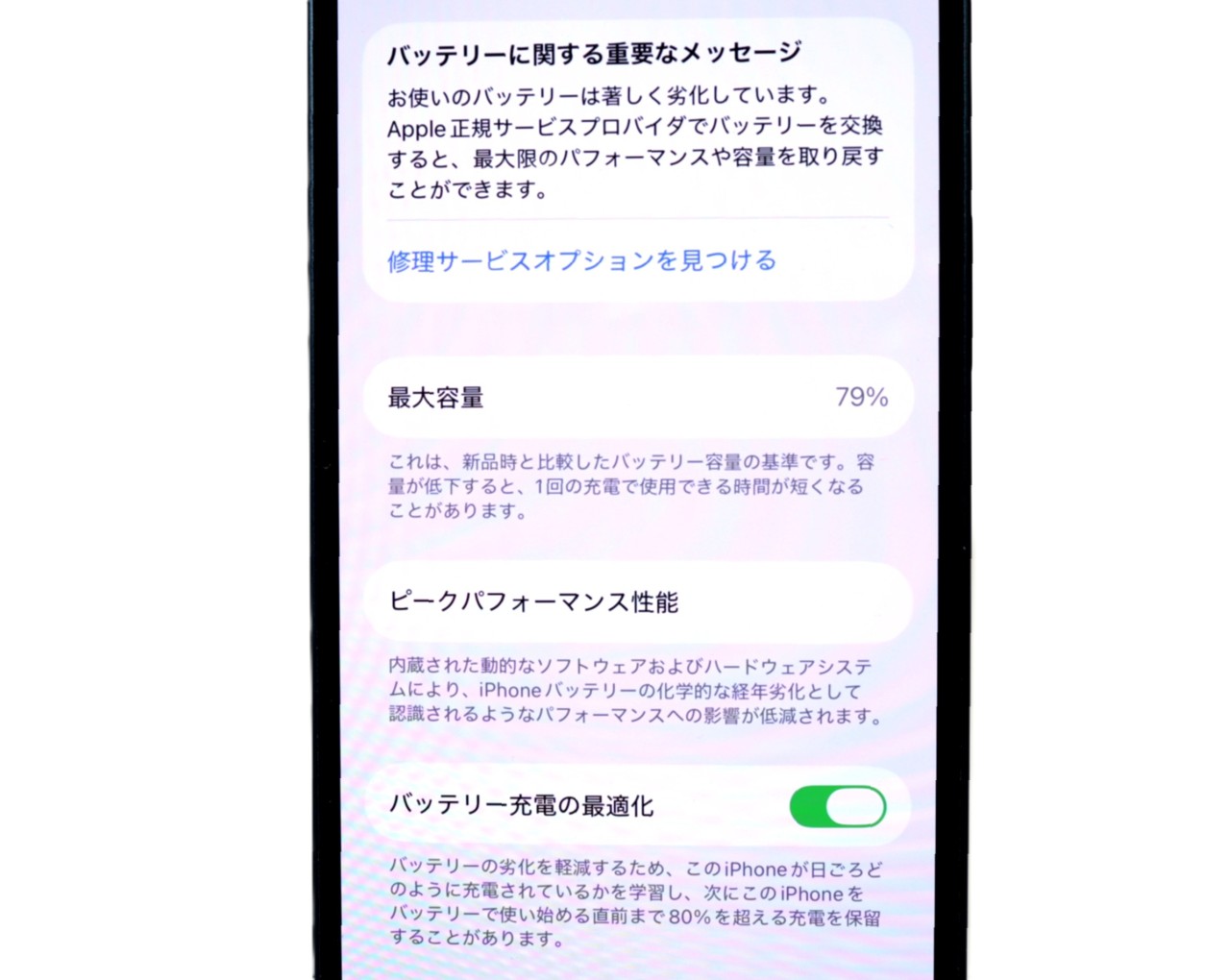 バッテリー最大容量=79%です。バッテリー劣化が進んでおります。