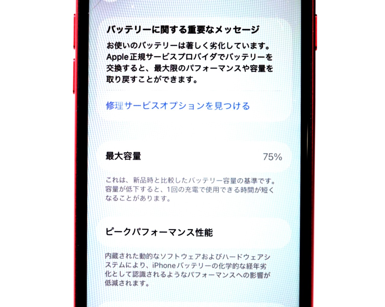 バッテリー最大容量=75%です。バッテリー劣化が進んでおります。