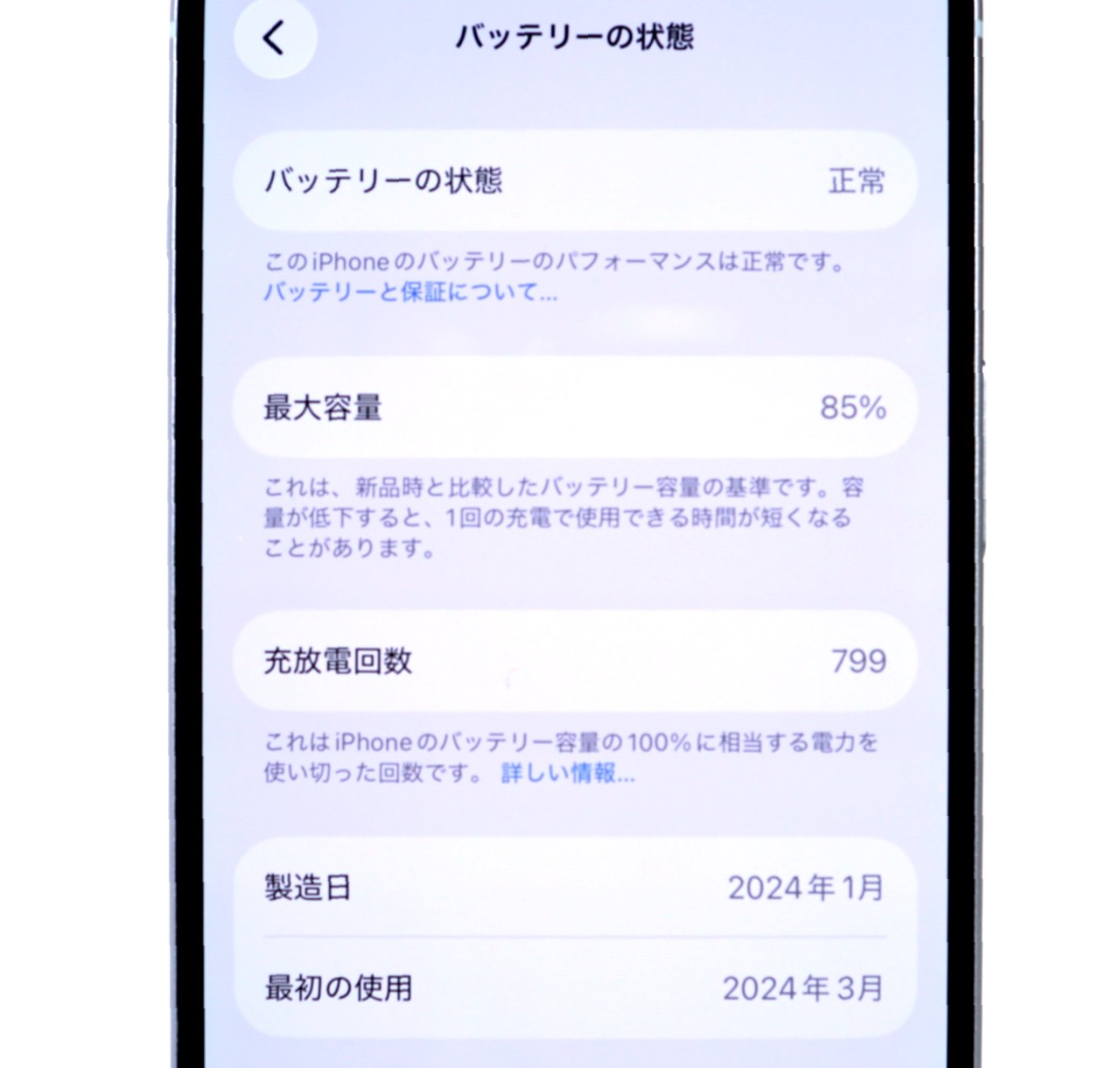 バッテリー最大容量=85%