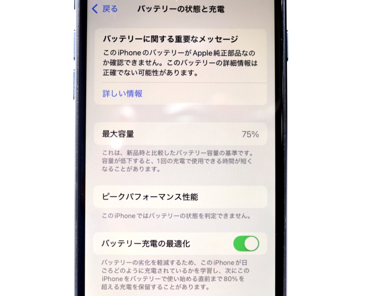 バッテリー最大容量=75%です。(互換バッテリーの劣化が進んでおります)