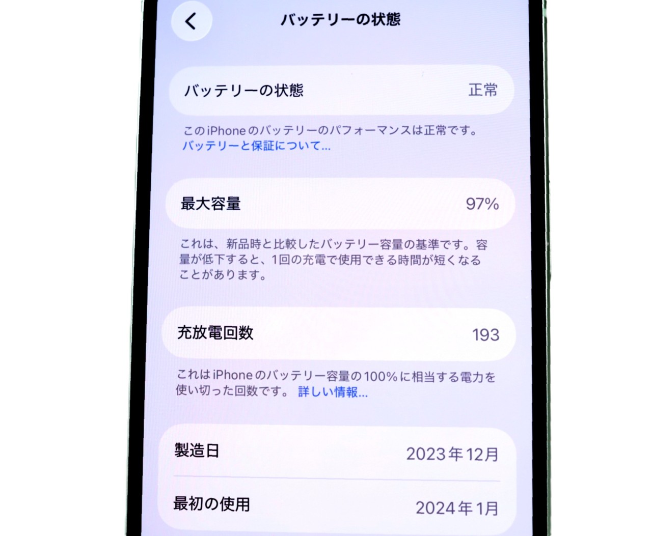 バッテリー最大容量=97%です。充放電回数=193回