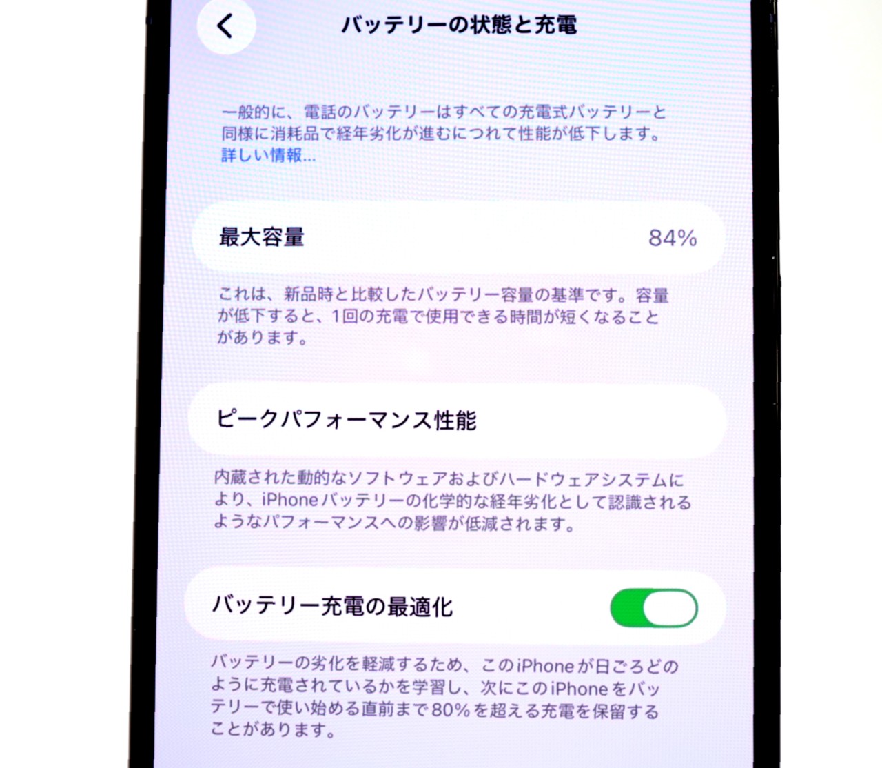 バッテリー最大容量=84%です。