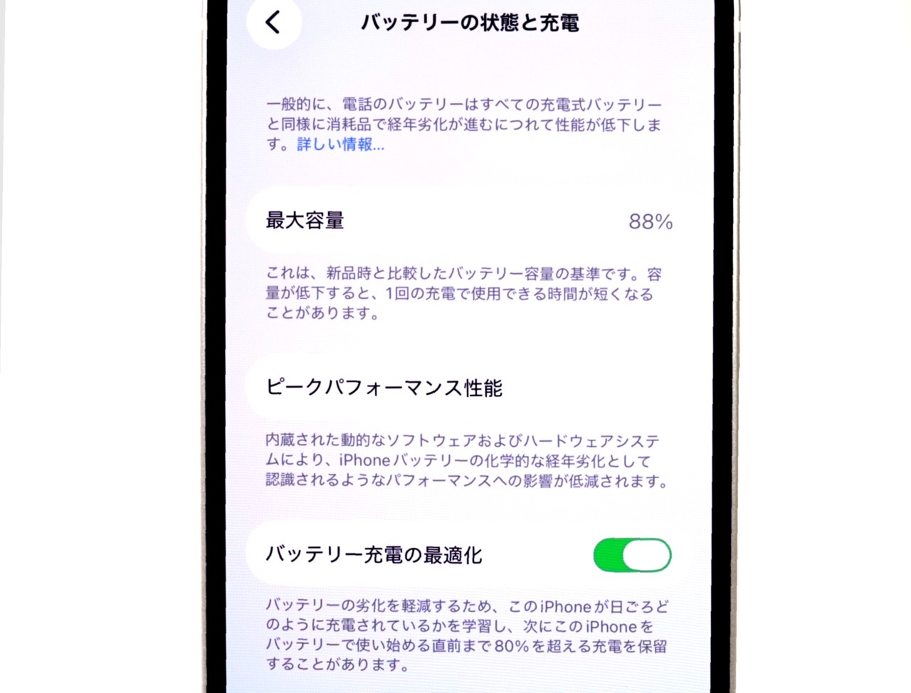 バッテリー最大容量=88%です。
