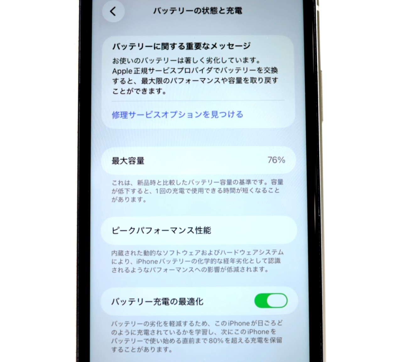 バッテリー最大容量=76%です。バッテリー劣化が進んでおります。